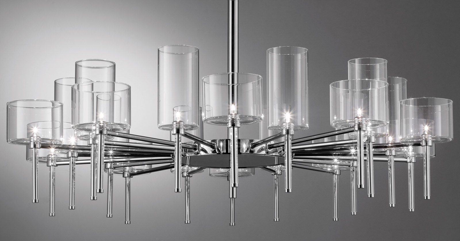 Обворожительная игра стеклянных бокалов, иногда перевернутых, наложение друг на друга бесцветных или цветных прозрачных элементов. Spillray — это эклектическая и элегантная коллекция, различные композиции которой способны создавать нежные плавные движения и изысканную игру цвета. Текучие геометрические формы, стеклянные чаши, предложены в различных моделях, и выходящий из них свет распространяется во всех направлениях. Предлагаются одиночные подвесные светильники, а также линейные модели (6 или 10 ламп) или модели в виде грозди (от 3 до 12 ламп). Варианты люстр: круглая на 30 ламп с двумя уровнями (новинка), круглая на 20 ламп с одним уровнем (новинка) или прямоугольная на 26 ламп (новинка). Предложены также встраиваемые плафоны с одной лампой (новинка), бра и настольные лампы высотой 35 или 50 см (новинка). Абажуры из стекла трех размеров: прозрачные, оранжевого, красного и серого цветов. Каркас из хромированного металла. По одному или в группе, светильники коллекции Spillray естественно вписываются в обстановку жилых и общественных помещений, создавая интерьер и становясь отличительными элементами любого пространства.