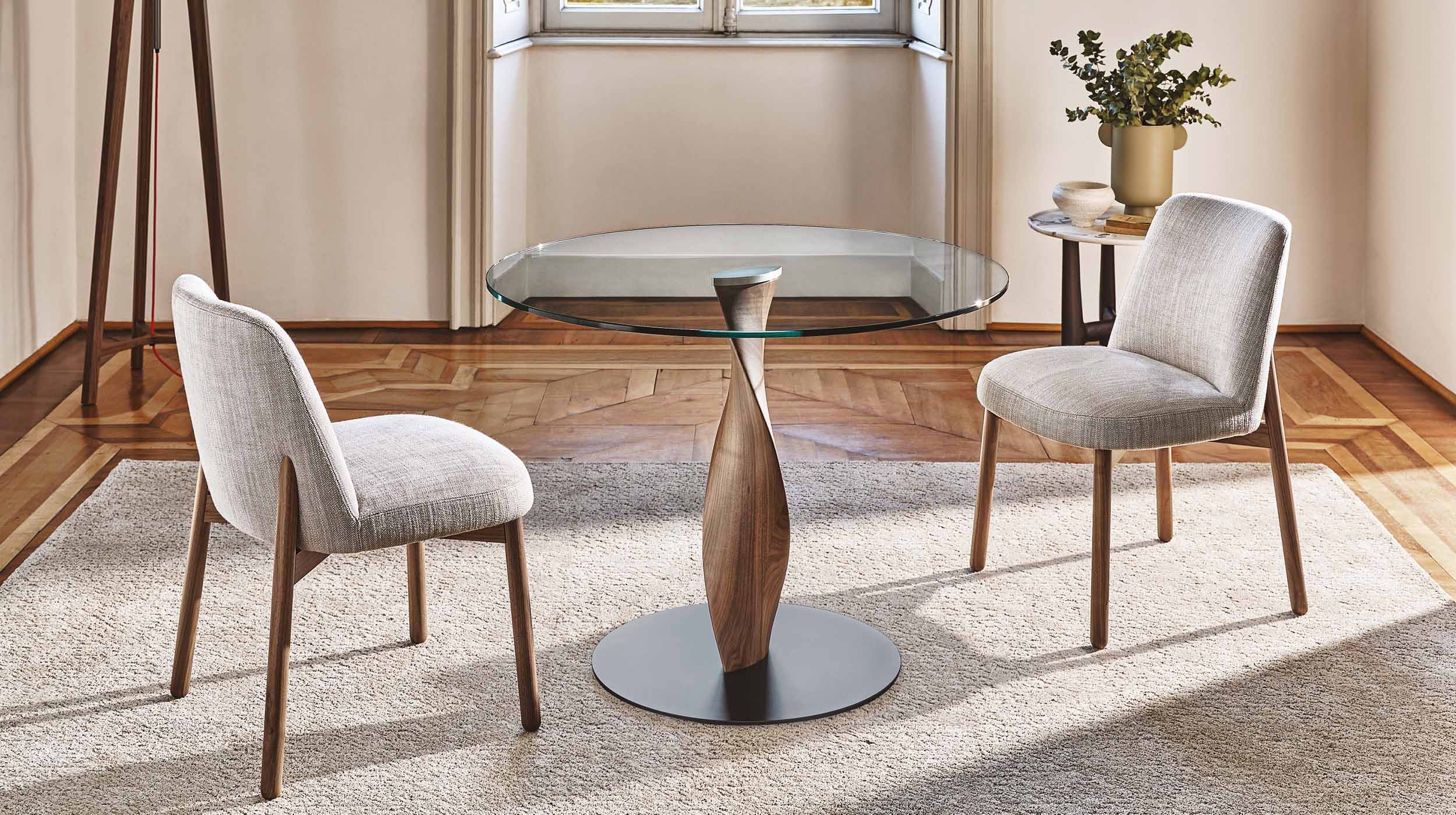 Обеденный стол Spin создан для тех, кто ценит элегантность и гармонию в интерьере. Его центральная база, выполненная в форме спирали из массива ореха Canaletta или ясеня, установлена на металлической пластине, что обеспечивает устойчивость и придаёт конструкции особый шарм. Металлическая пластина не только выполняет функциональную роль, но и служит элегантным дополнением, подчёркивая изысканность стола.