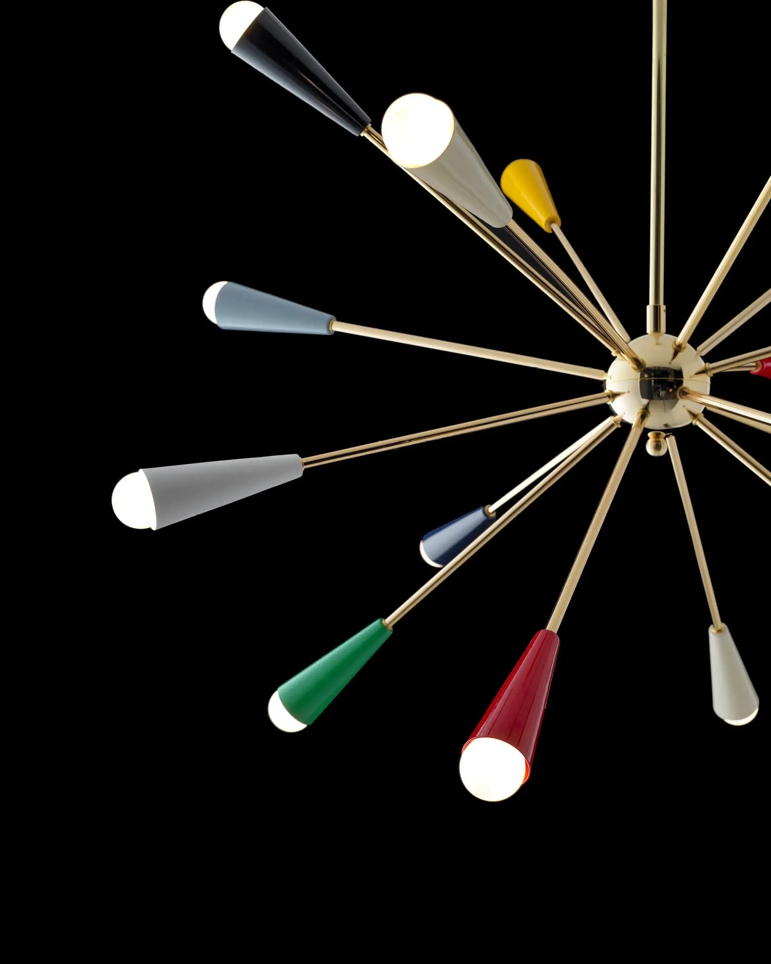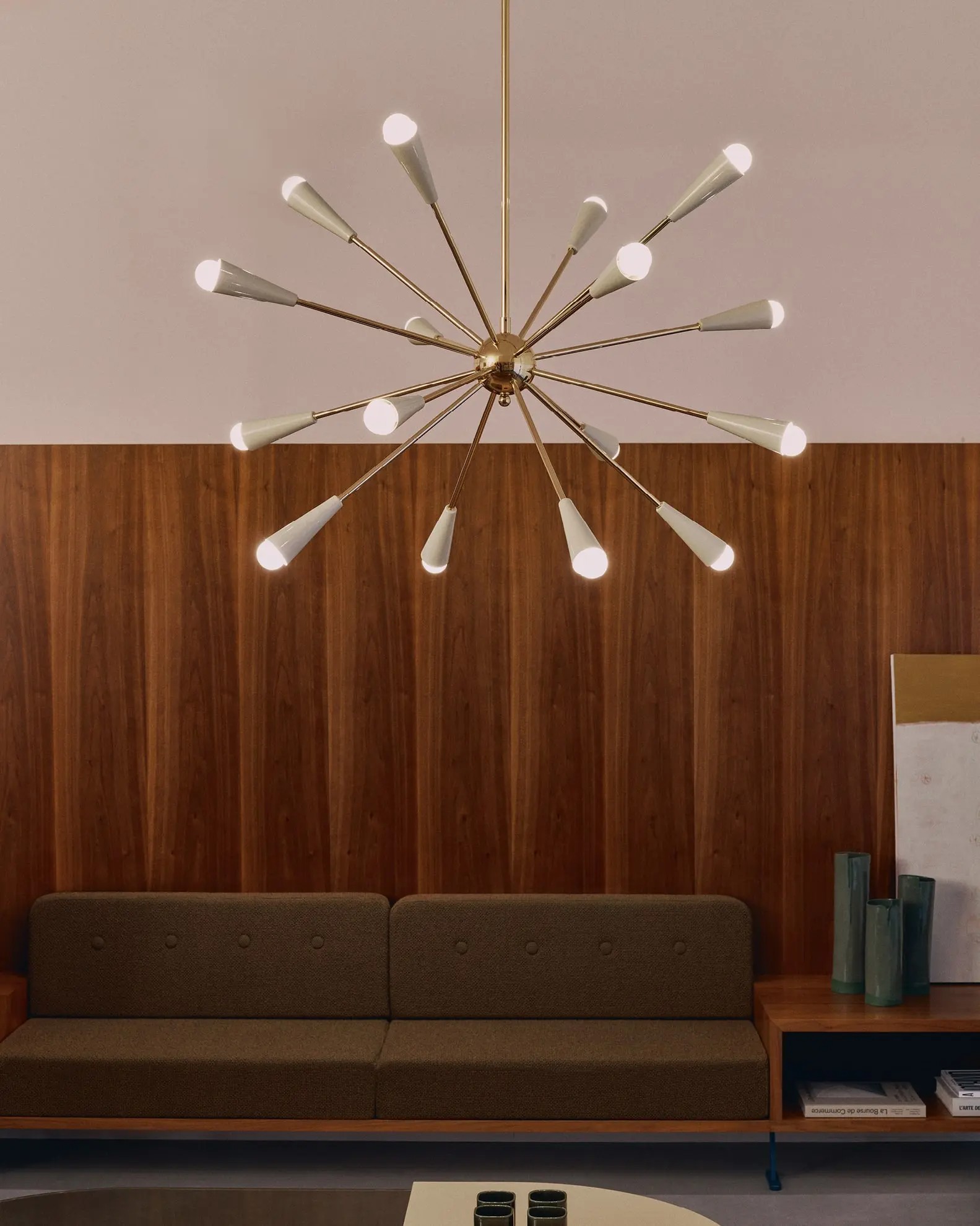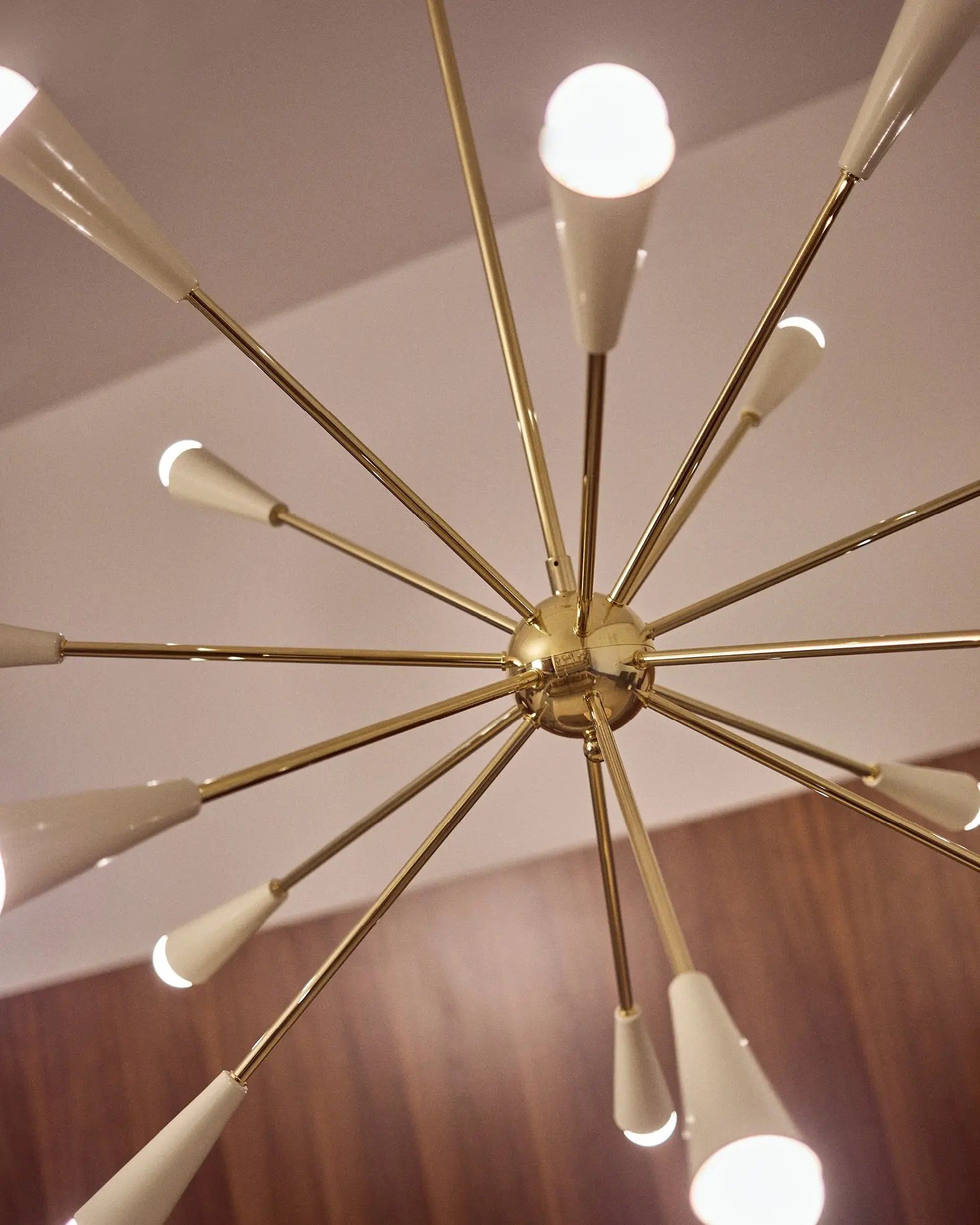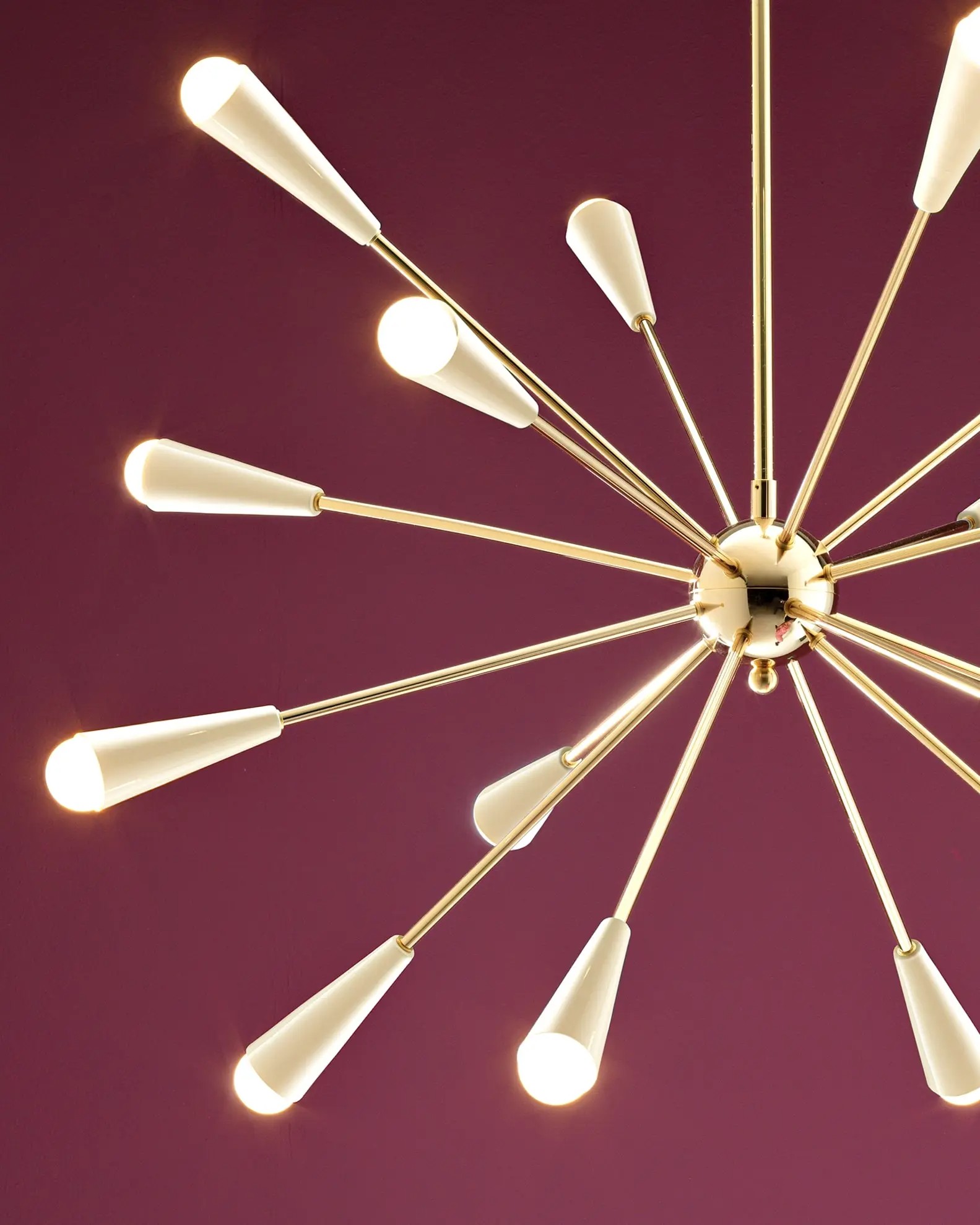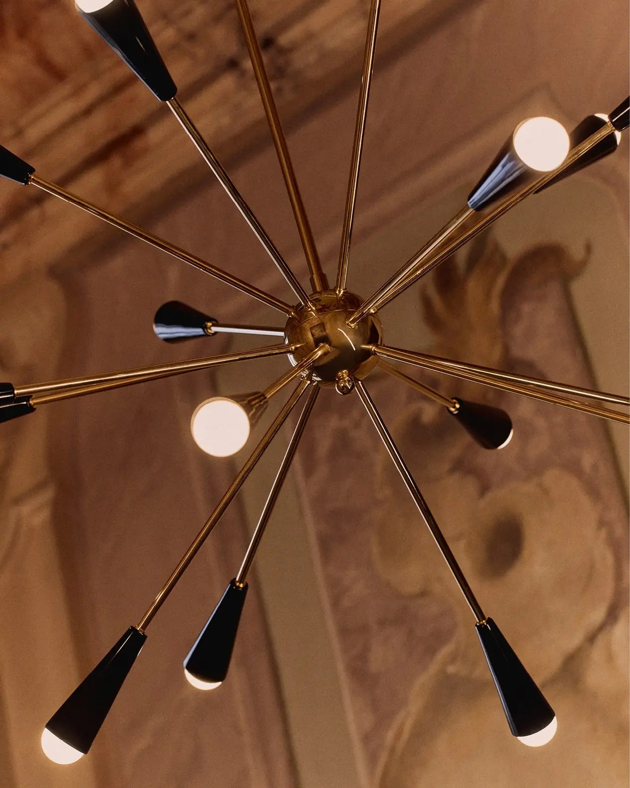 Подвесной светильник Sputnik suspension превращает обычное освещение в настоящее зрелище. Его 16 кронштейнов расходятся во все стороны, создавая эффект праздничного фейерверка: свет переливается и играет на металлических поверхностях, наполняя пространство мягким, завораживающим сиянием.