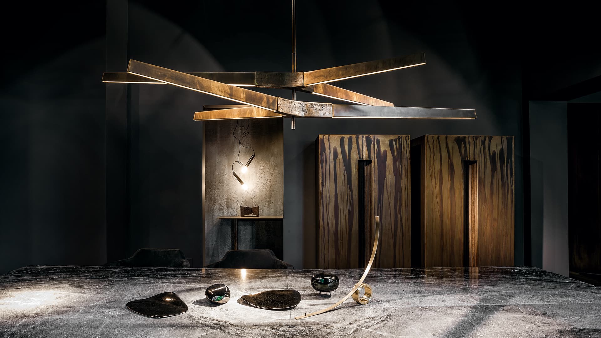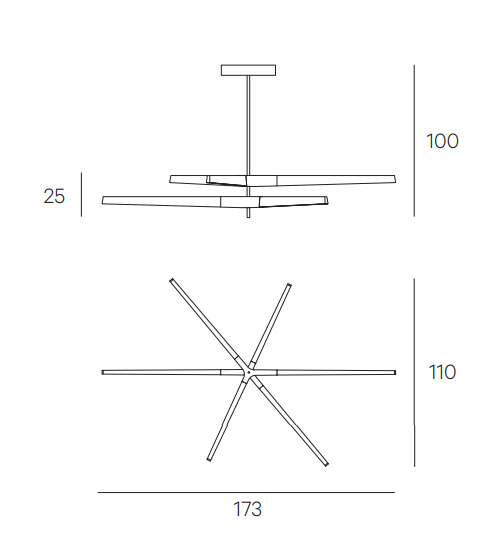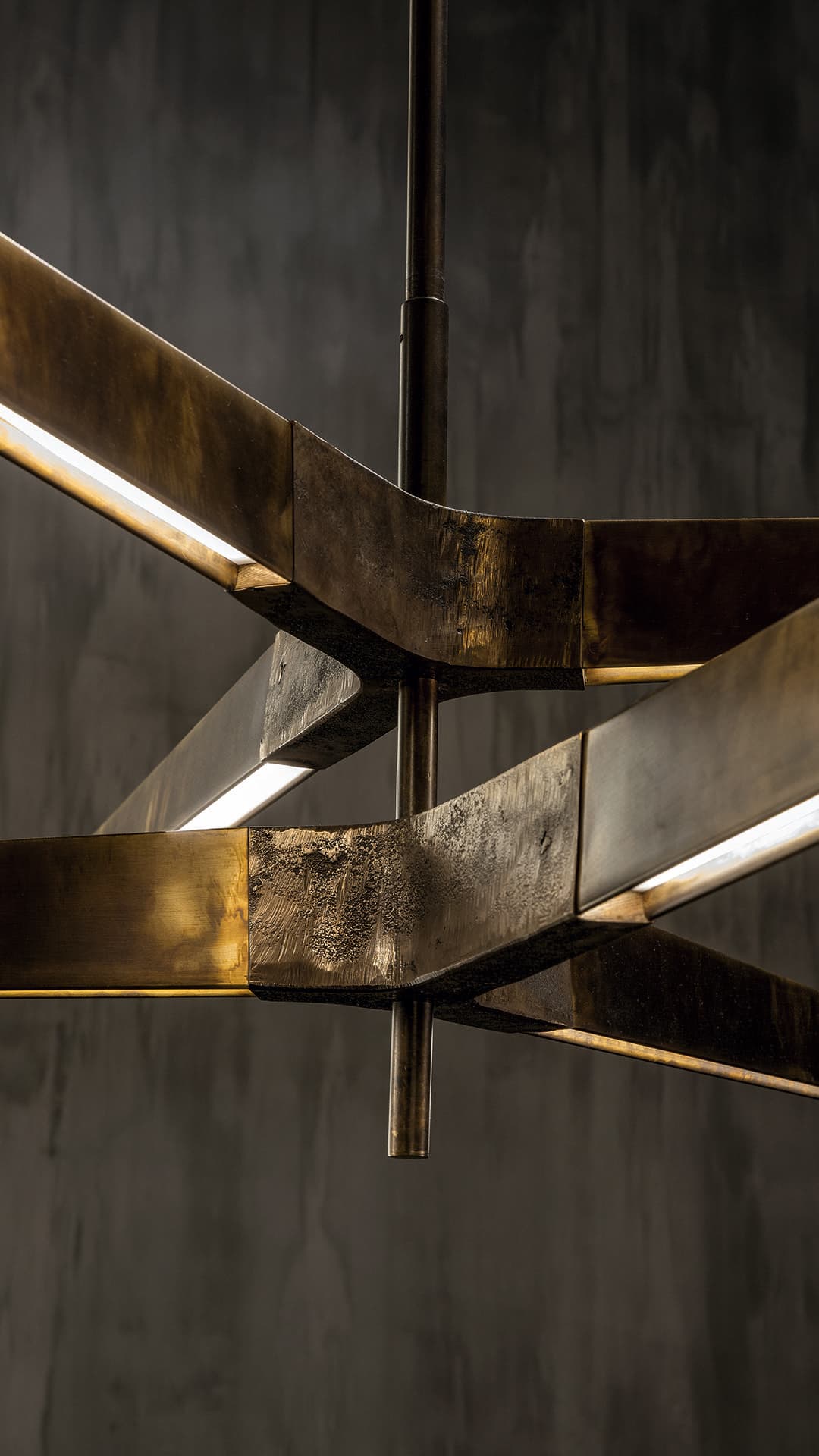 Основа светильника выполнена в виде Y-образного литого каркаса с металлическими лопастями, что придаёт ему современный и динамичный вид. Необычные комбинации смелых геометрических форм создают обширные и эклектичные световые ландшафты, которые можно адаптировать под различные интерьерные решения.