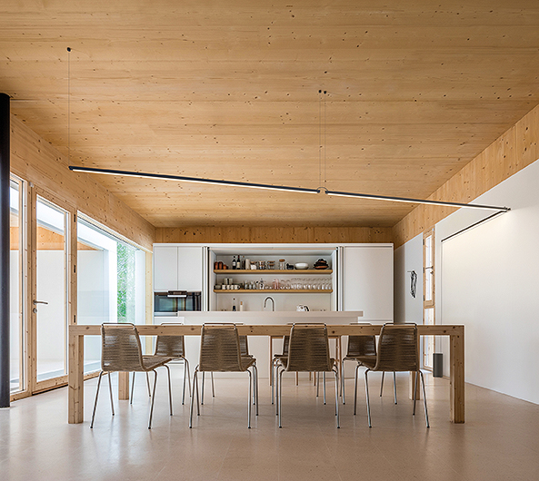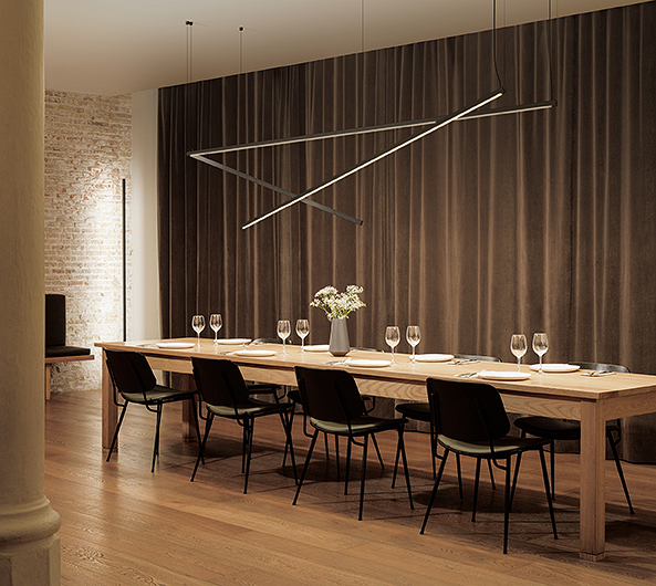 Светильник крепится горизонтально и доступен в различных длинах, что позволяет гибко подбирать решение под любое помещение — будь то кухня, столовая, гостиная или рабочая зона. Тонкий световой стержень парит в воздухе, создавая ощущение лёгкости и воздушности.
