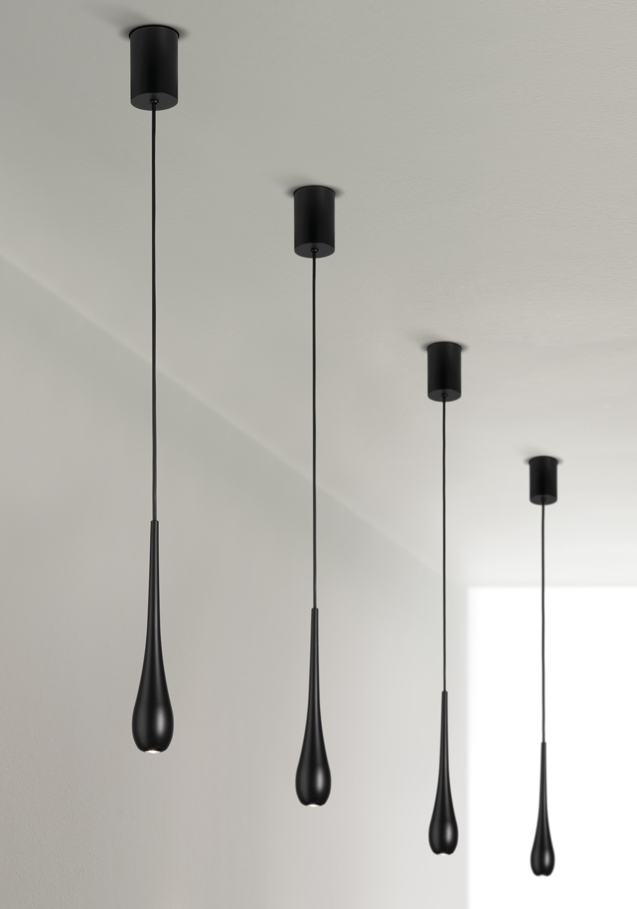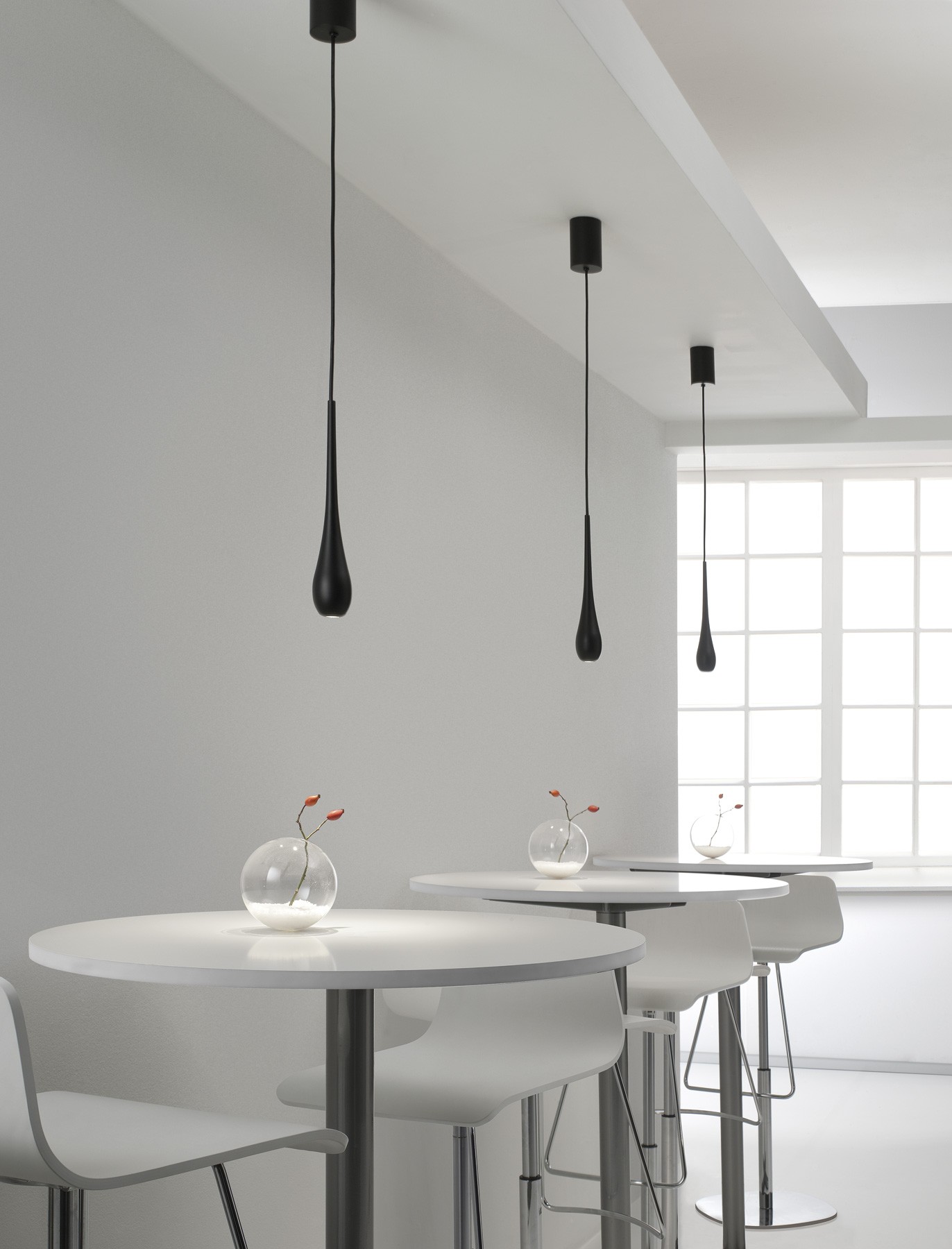 Stilla (капли) - название вызывает характерную форму светильников в этой серии. Подвесной и потолочный модели в серии Stilla создаются из алюминиевого сплава с покрытием черного цвета. Подвесная версия со светодиодной лампочкой высокой мощности (1 х 6 Вт) доступна в различных вариантах: одна (с классическим подвесным фитингом, встроенная или на шинопровод. Лампы могут быть расположены не по центру), и как композиция (с потолочной розой). Потолочная версия с мощным светодиодом (1 х 6 Вт + 48 х 0,1 Вт) доступна с классическим вариантом установки или встроенный монтаж. Дизайн: Мануэль Вивиан.