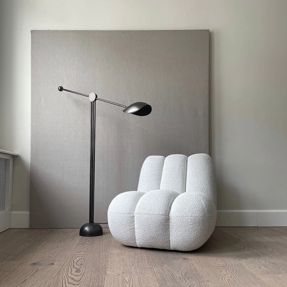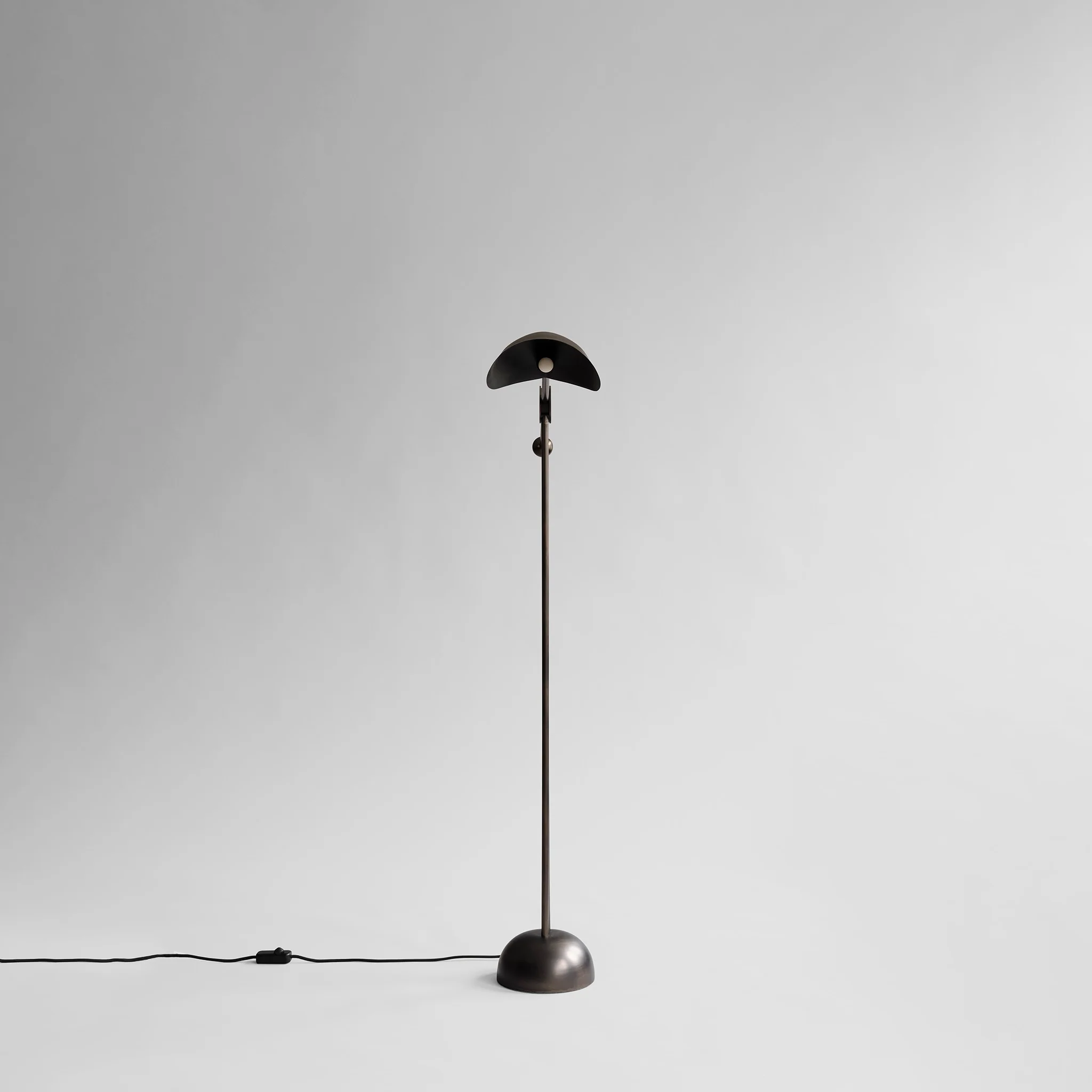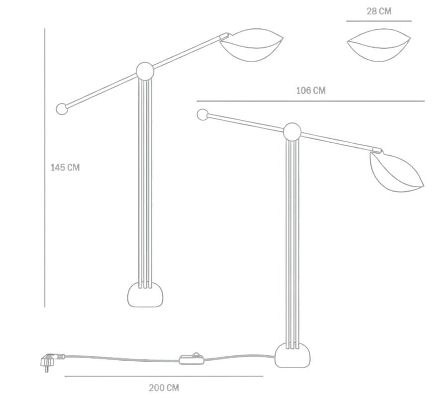 Трёхногая конструкция торшера, закреплённая на полукруглом основании, вносит в композицию ритмичный баланс и непринуждённую простоту. Эта форма не только функциональна, но и эстетически привлекательна, придавая изделию современный и стильный вид. Регулируемый кронштейн позволяет легко настроить положение абажура, что обеспечивает идеальное равновесие и позволяет адаптировать торшер под различные нужды и предпочтения.