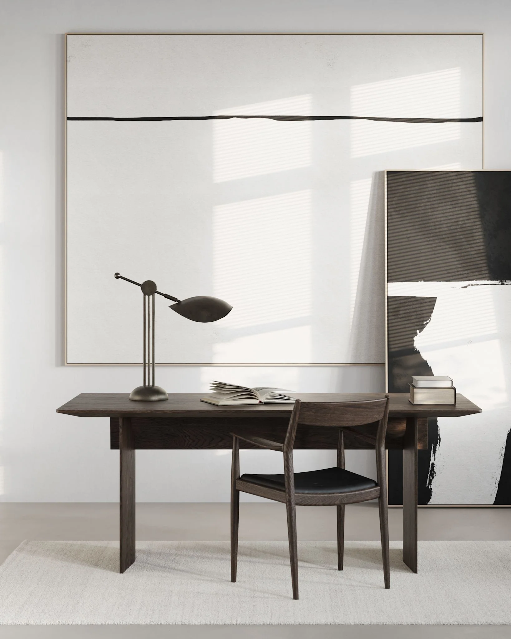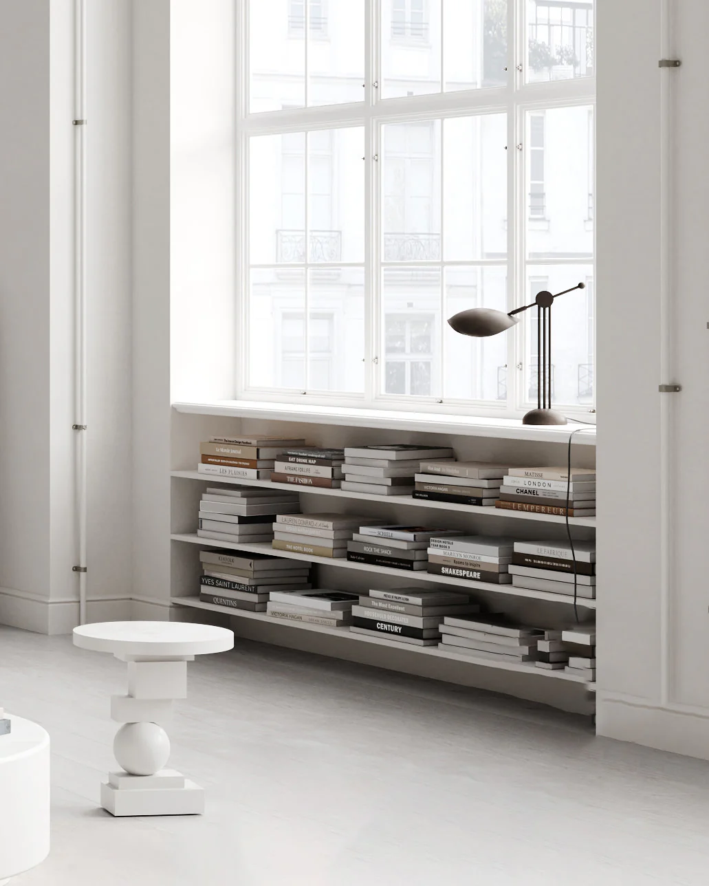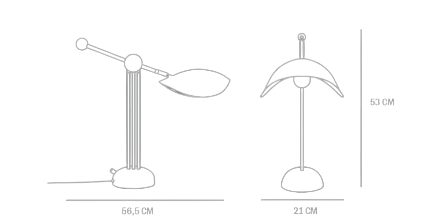 Светильник отличается тщательно продуманной конструкцией, которая гармонично вписывается в интерьер, создавая ощущение лёгкости и утончённости. Трёхногая подставка, закреплённая на полукруглом основании, придаёт композиции ритмичный баланс и непринуждённую простоту. Регулируемый кронштейн позволяет точно настроить положение абажура, обеспечивая оптимальное освещение. Элегантная сфера, дополняющая дизайн, символизирует художественный контраст и невесомость. Вместе эти элементы создают атмосферу изысканности и утончённости, добавляя пространству шарма и элегантности.