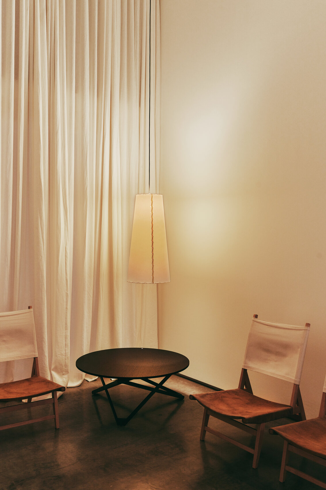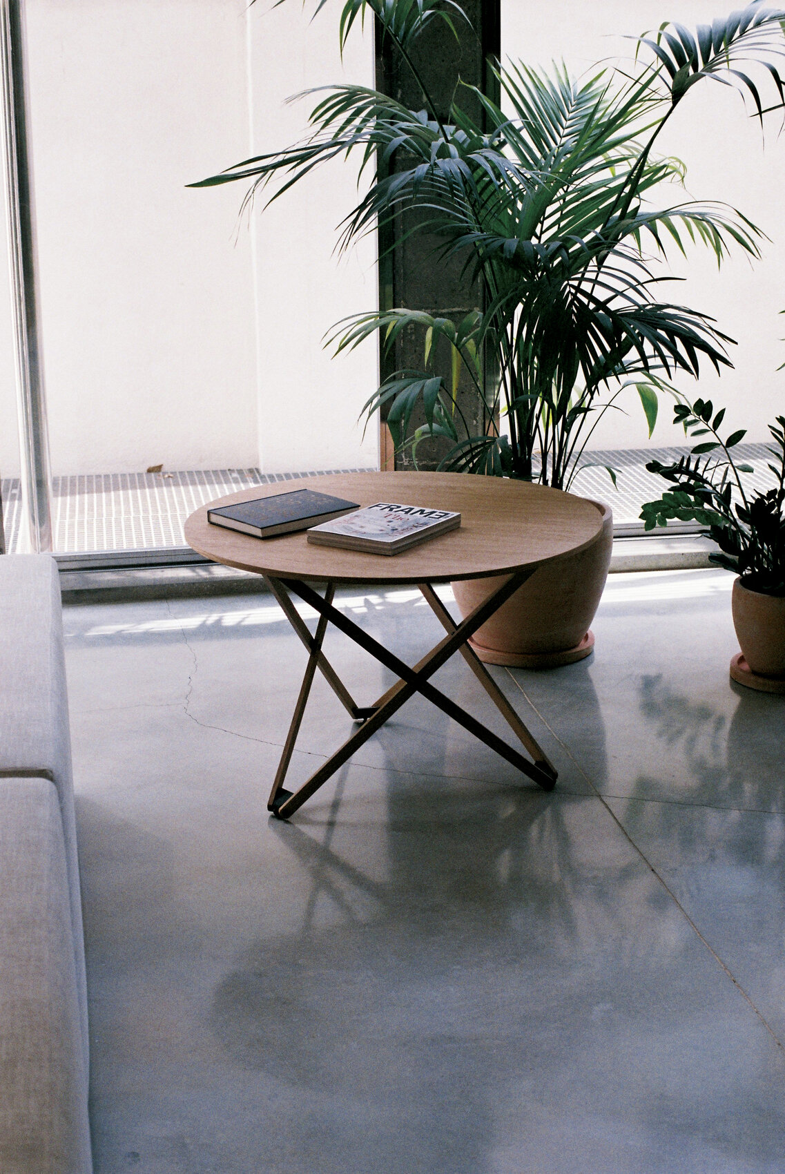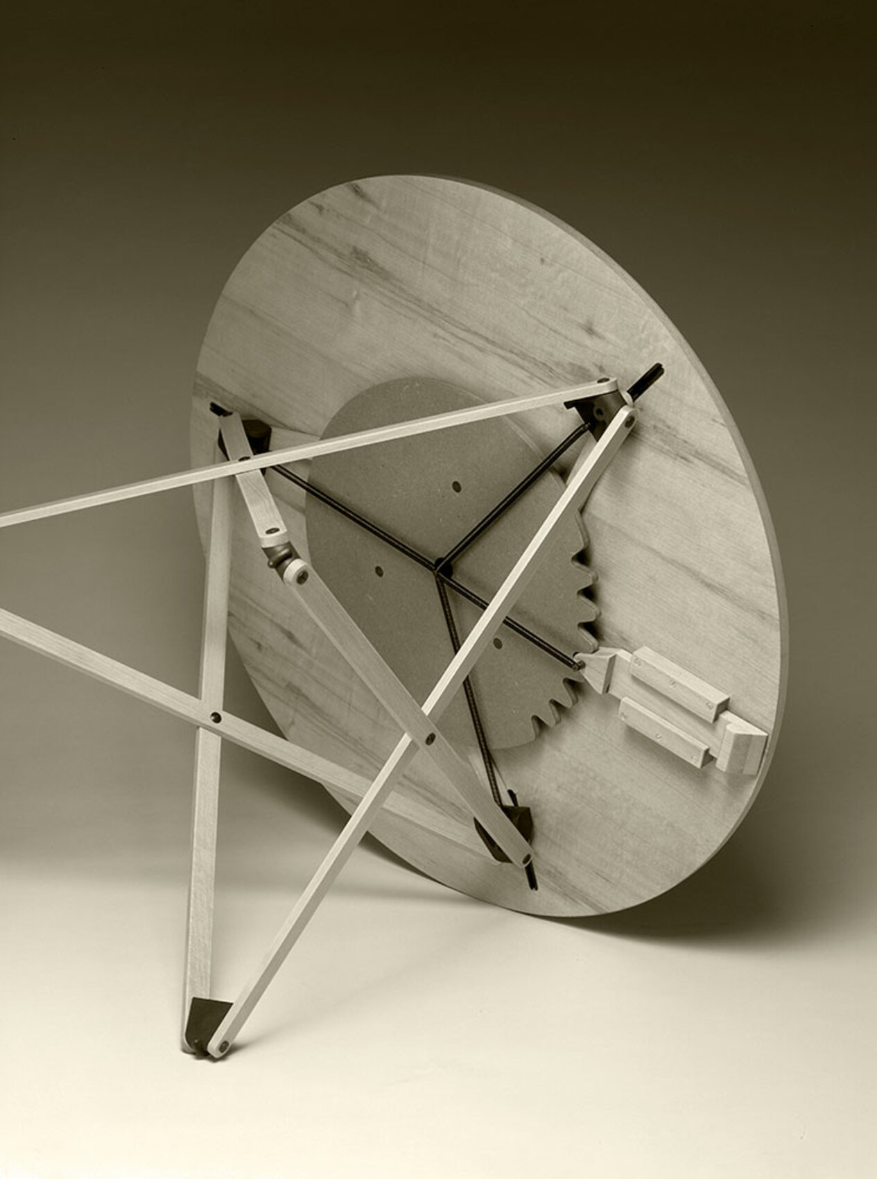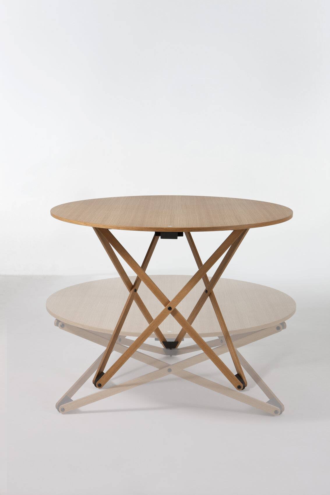 Круглая столешница изготовлена из дуба. Она имеет натуральную или чёрную отделку, что придаёт столику стильный и лаконичный вид. Шарнирные ножки также изготовлены вручную, что подчёркивает качество и уникальность каждого изделия.