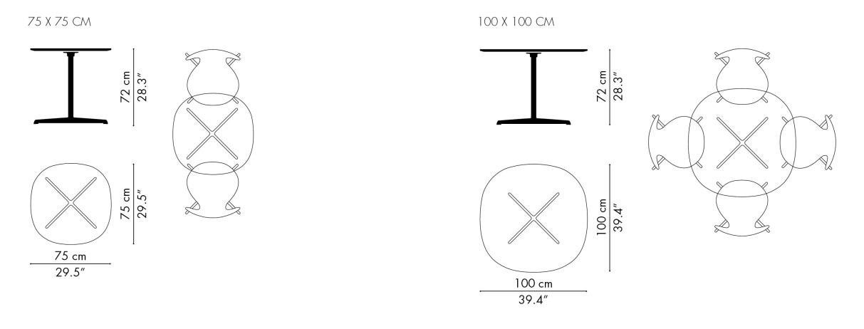 Стандартные размеры стола: диаметр 75 см и высота 72 см. Например, такие параметры позволяют разместить его в узких проходах или в зонах с плотной расстановкой мебели. Компактные габариты экономят пространство, но при этом оставляют достаточно места для блюд и напитков. Кроме того, модель доступна в вариантах с увеличенным диаметром 100 см. Это делает её удобной для групповых зон. Например, в кафе можно объединить несколько столов, создавая зоны для компаний.