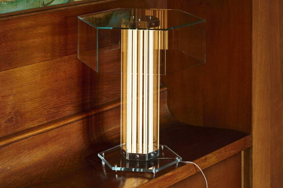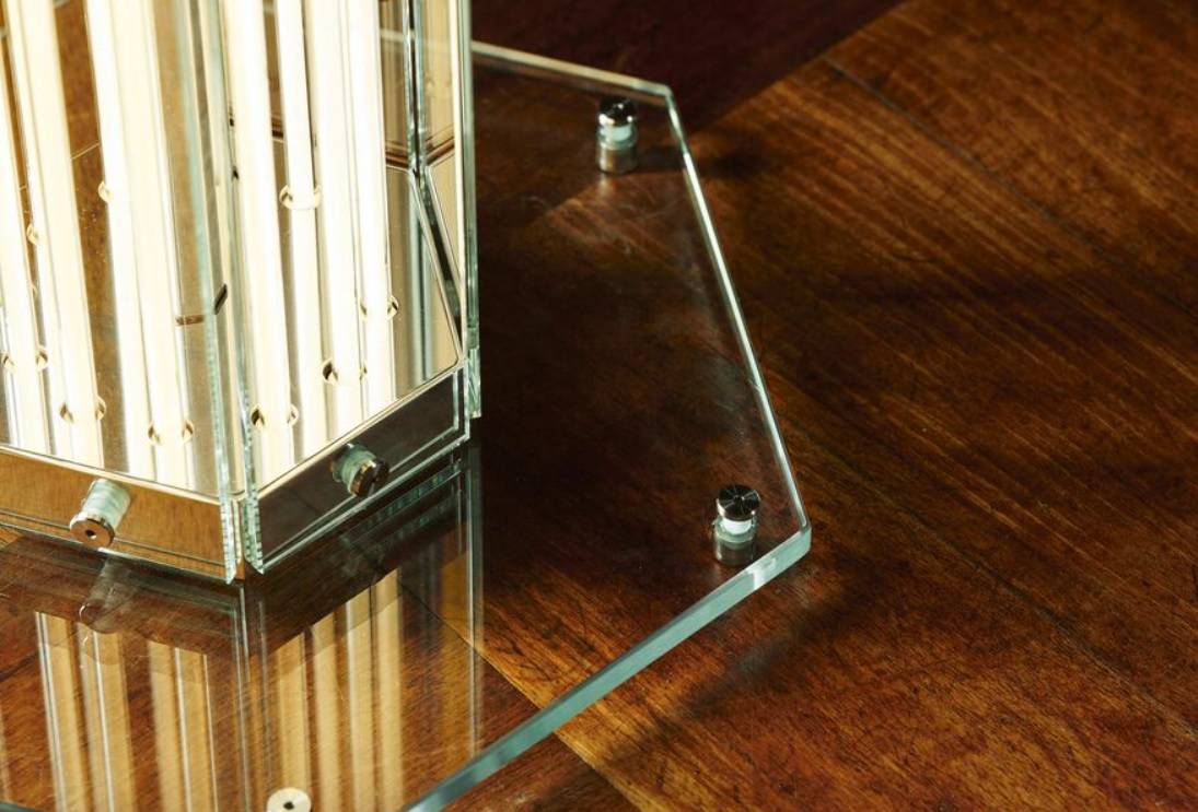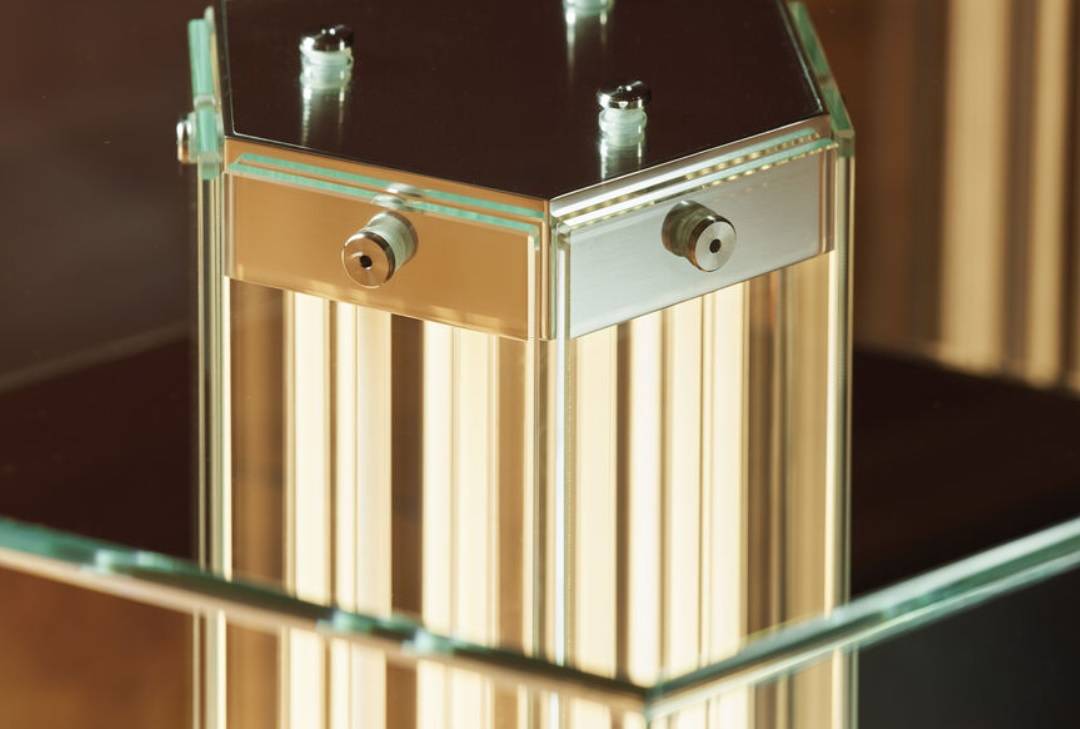 Материалы — только плоское стекло и полированный алюминий — подчёркивают честность конструкции и ремесленное качество. Никаких лишних деталей, только свет, форма и материал.
