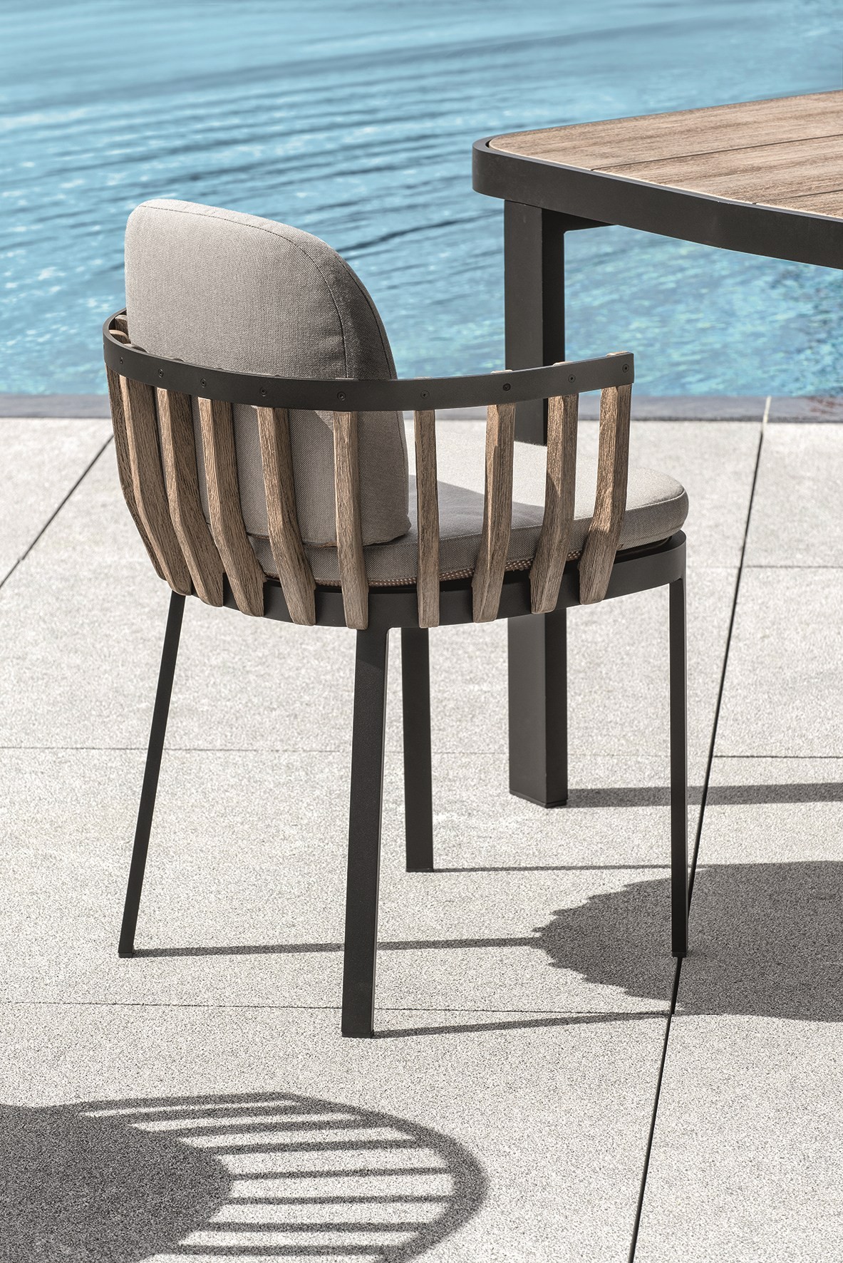 Swing — мягкий стул от фабрики Ethimo. Спинка и подлокотники модели изготавливаются из натурального или состаренного тика. Ножки и основание стула производятся из металла в белом или черном цвете. В коллекцию входят несколько видов столов, садовые качели, кресло и модульный диван. Дополнительно можно приобрести чехол от дождя. Более подробную информацию можно уточнить у менеджера.