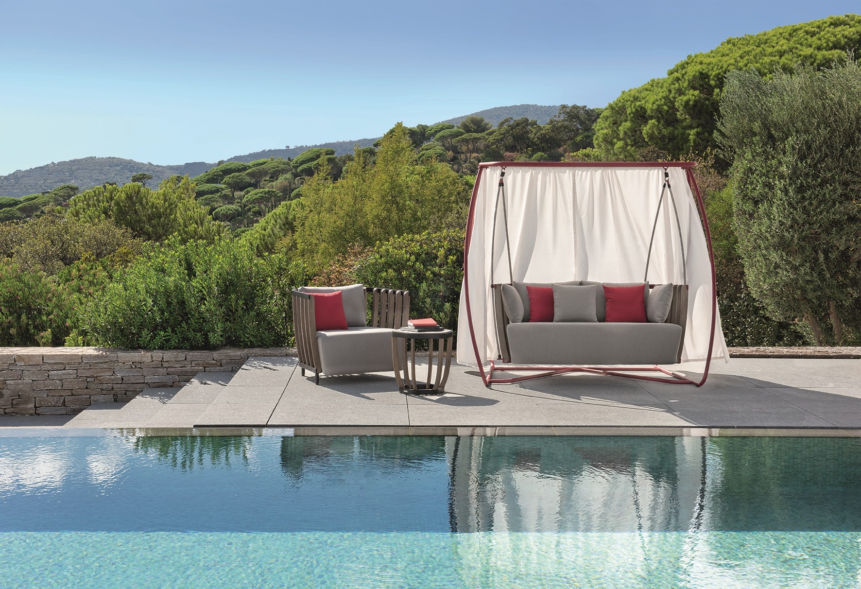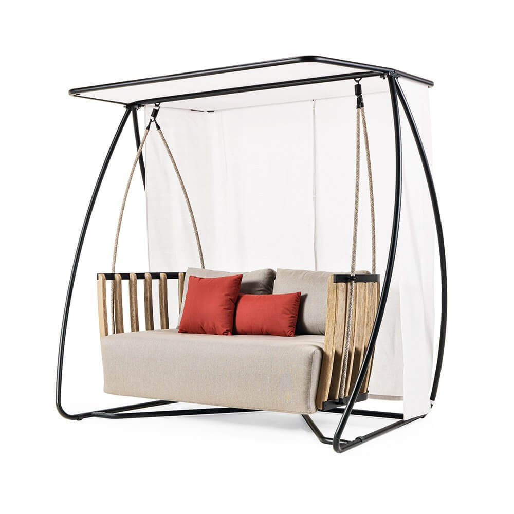 Swing — удобные садовые качели от фабрики Ethimo. Спинка и подлокотники модели изготавливаются из натурального или состаренного тика. Ножки и основание качели производятся из металла в белом, красном или черном цвете. В коллекцию входят несколько видов столов, кресло, стул и модульный диван. Дополнительно можно приобрести чехол от дождя. Более подробную информацию можно уточнить у менеджера.