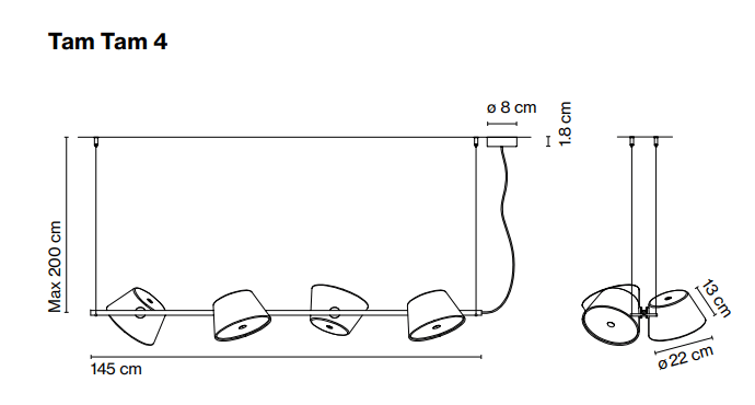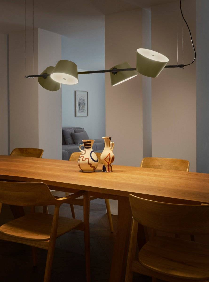 Творческий и игривый подвесной светильник Tam Tam 4 представляет собой воплощение динамичной и выразительной концепции, которая придаёт интерьеру особую атмосферу. Tam Tam 4, оснащённый четырьмя абажурами, не только украшает пространство, но и активно участвует в его организации, создавая уникальные визуальные эффекты.