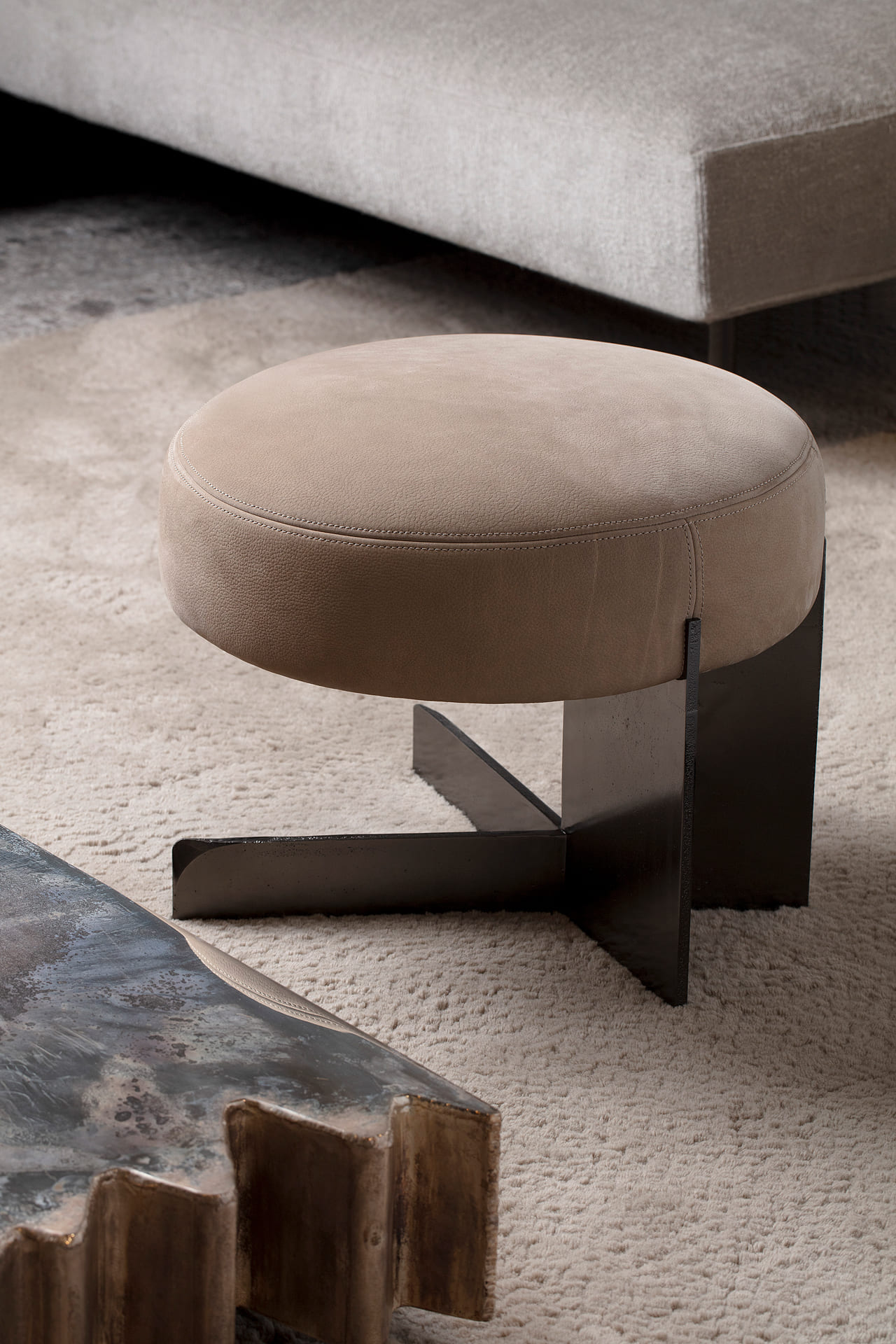 Металлическая ножка пуфа не только придаёт ему прочность и долговечность, но и служит стильным акцентом, который легко сочетается с различными элементами интерьера. Мягкое сиденье, выполненное из качественных материалов, обеспечивает максимальный комфорт и приятные тактильные ощущения.
