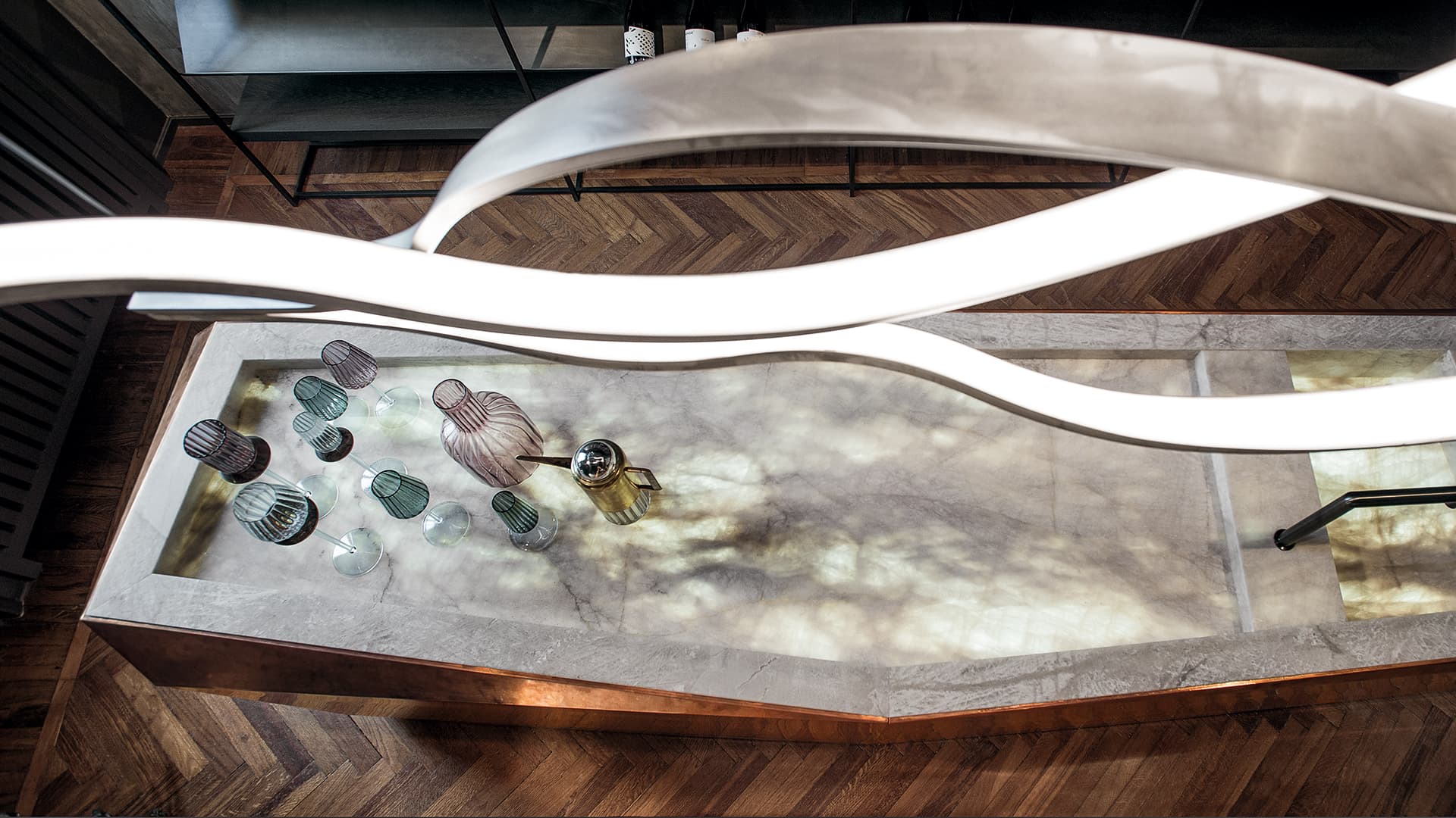 Подвесной светильник Tape отличается изящными, плавными и органическими формами, которые словно наполнены безудержным и взрывным динамизмом. Эти формы создают множество гармоничных, текучих и сложных последовательностей, придавая светильнику особую эстетику.