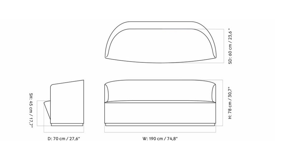 Его размеры идеально подходят для уютных гостиных и просторных студий. Высота дивана составляет 78 см. Ширина равна 190 см. Глубина дивана — 70 см. Высота сиденья — 45 см. Глубина сиденья — 60 см. Высота подлокотников также составляет 78 см.