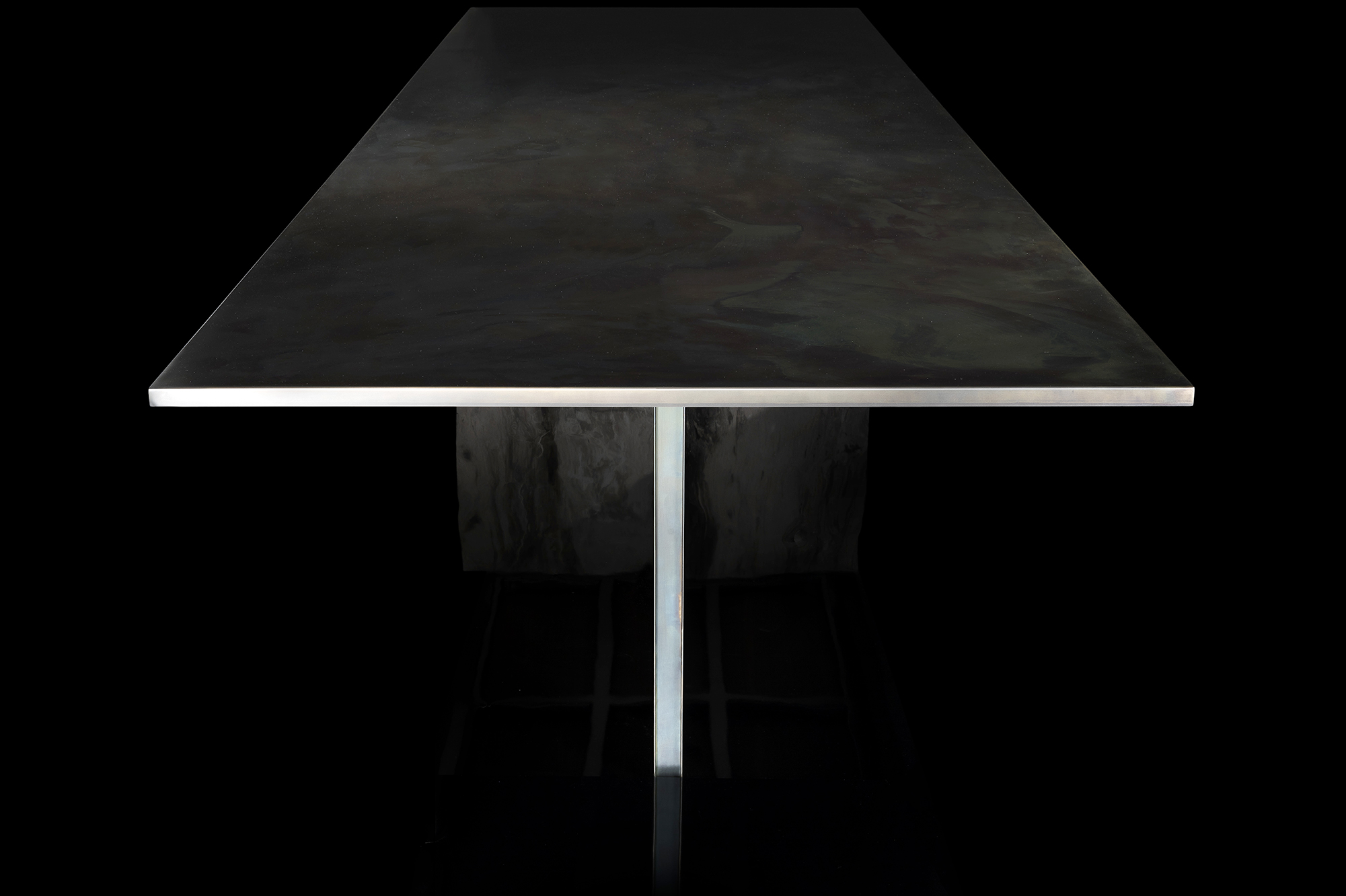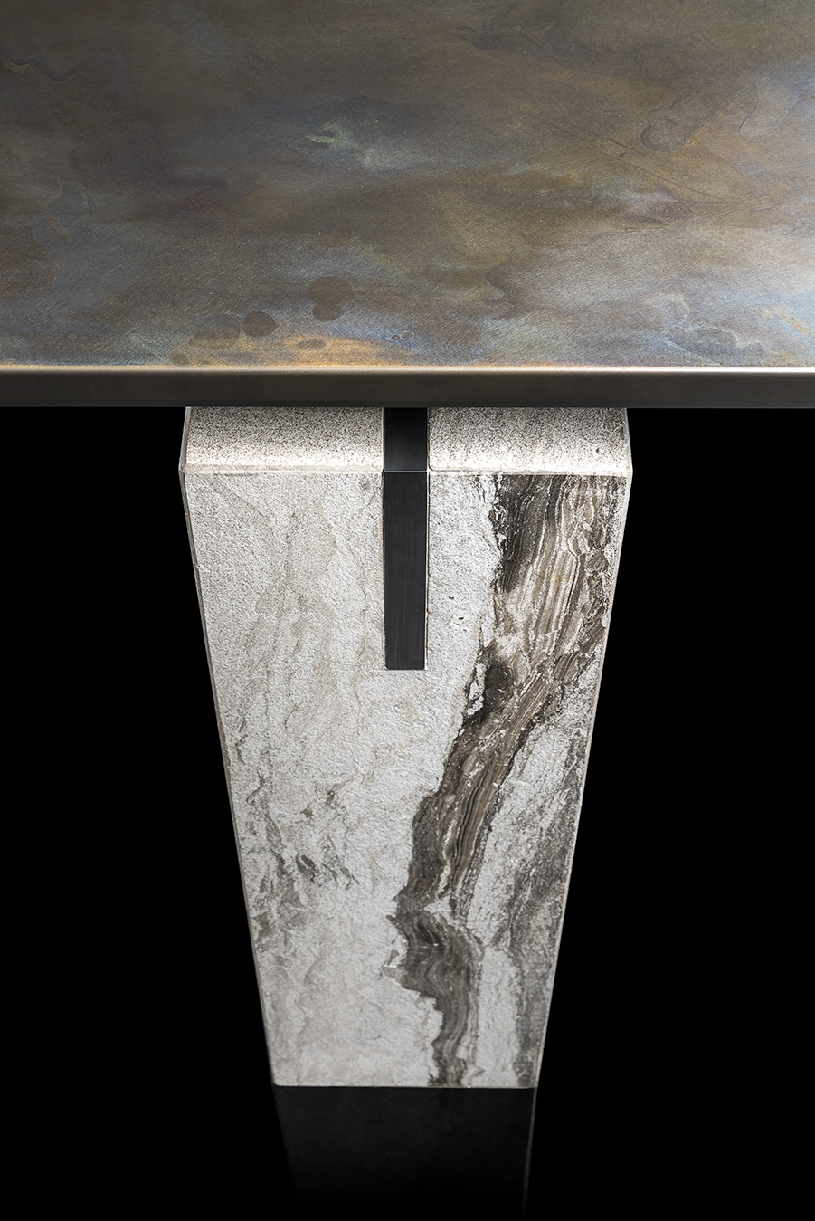 Рамка стола изготовленная из высококачественной чёрной полированной стали, придаёт изделию элегантный и современный вид. Одна из ножек выполнена из массивного камня толщиной 20 сантиметров, что не только придаёт столу дополнительную устойчивость, но и добавляет ему выразительности и солидности. Эта массивная деталь создаёт контраст с изящной стальной рамой, подчёркивая её утончённость. Вторая ножка стола изготовлена из металла толщиной всего 3,9 сантиметра, что придаёт конструкции лёгкость и динамичность.