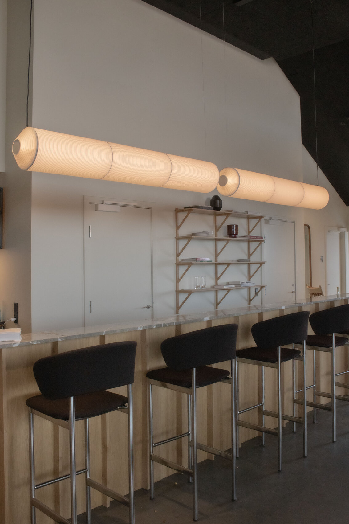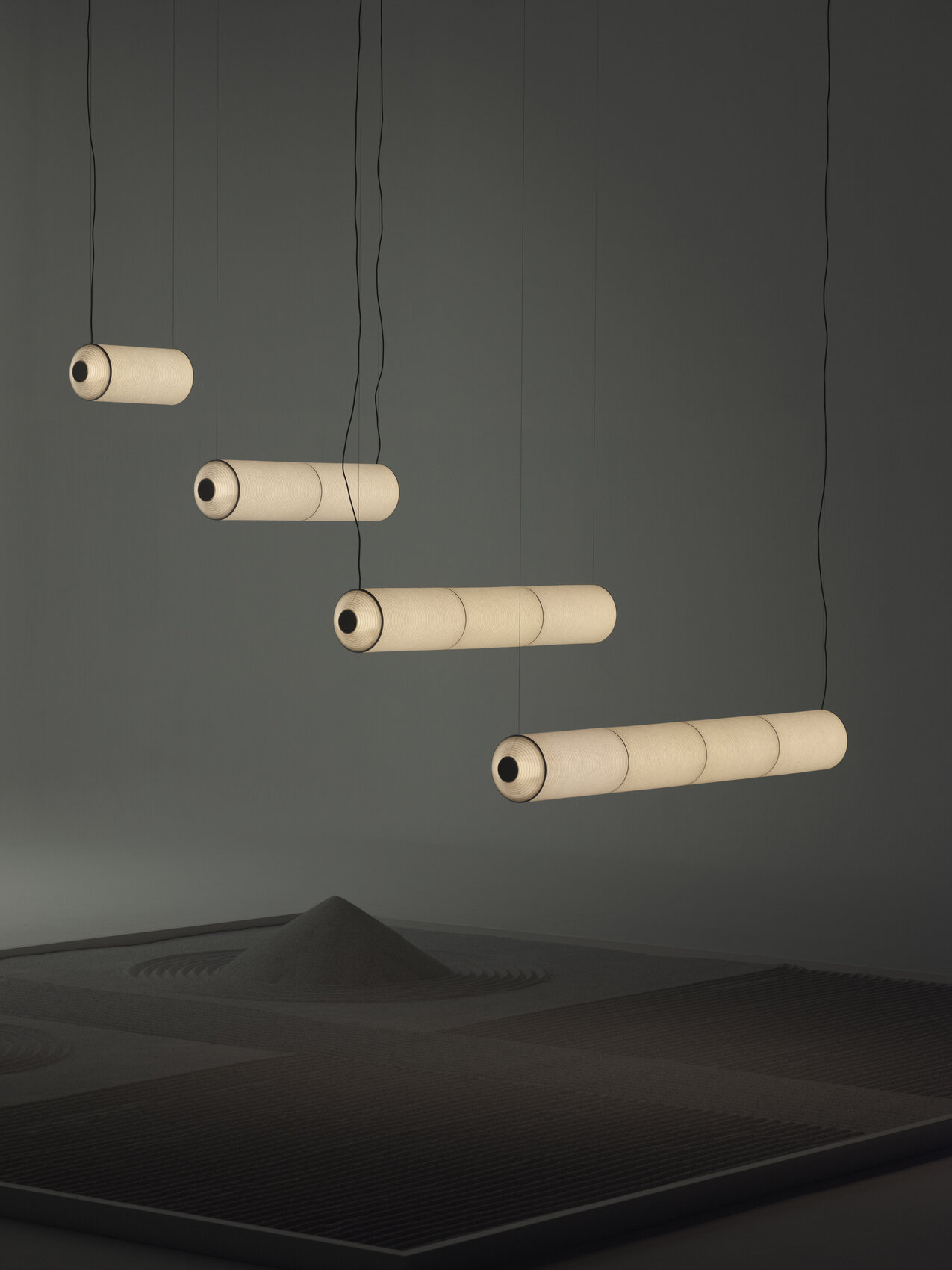 Конфигурируемый от одного до четырех модулей, светильник становится универсальным. Есть четыре варианта длины, а диаметр всегда одинаковый — 25 см. Так проще подобрать размер под ваше помещение.