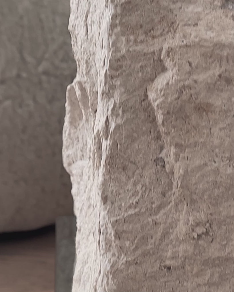 Первый вариант Temple Coffee Table выполненный полностью из натурального известняка, позволяет в полной мере оценить природную красоту этого материала. Массивная столешница изготовлена из цельного куска известняка. Боковые грани обработаны вручную. При этом сохранена некоторая грубость и естественная фактура. Это подчёркивает аутентичность и связь с природой. Верхняя плоскость столешницы идеально отполирована. Это придаёт ей изысканный и завершённый вид.