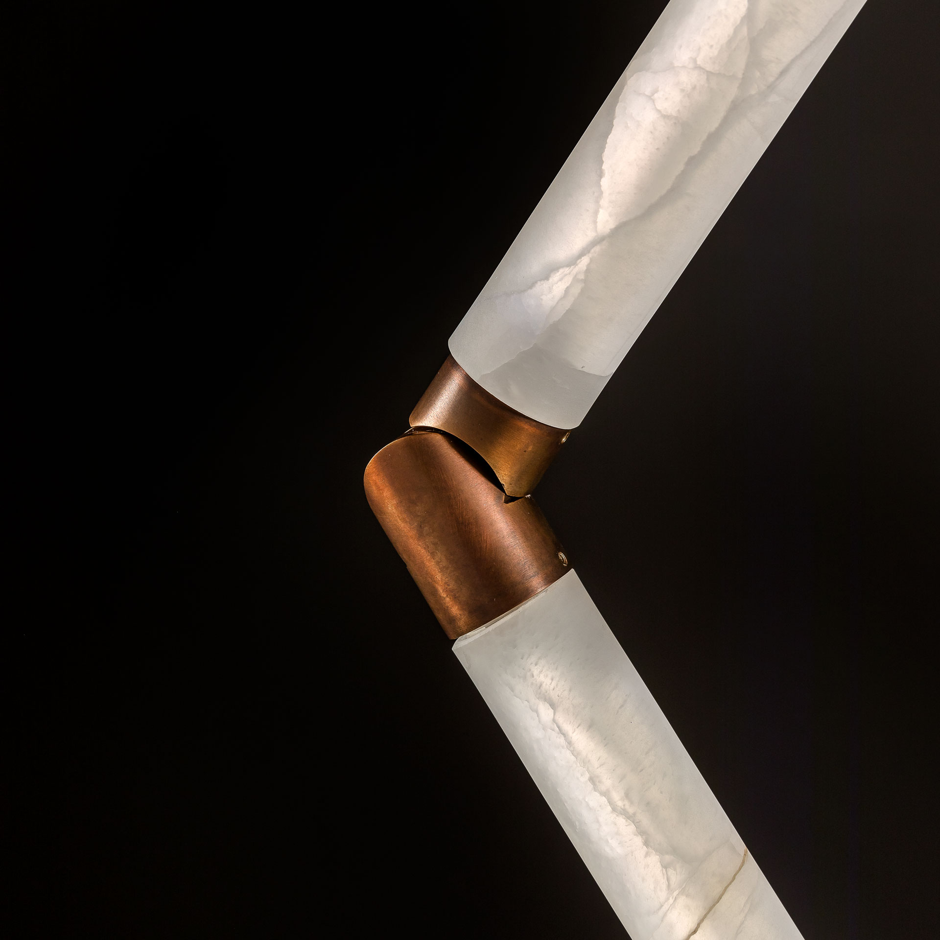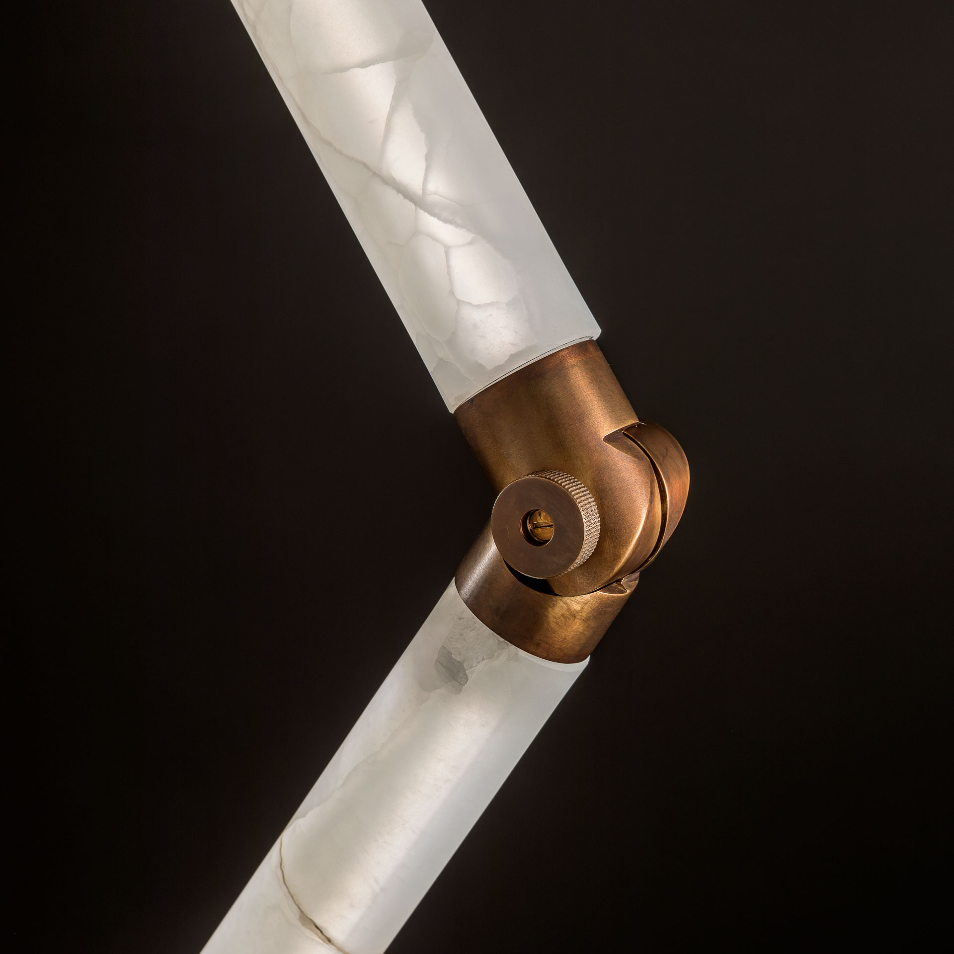 Цилиндрические плафоны, изготовленные из ледяного оникса, плавно соединены между собой латунными шарнирами. Этот элемент дизайна не только придаёт торшеру функциональность, но и добавляет ему нотку роскоши и изысканности. Латунные детали придают изделию особый шарм, делая его заметным и привлекательным в любом интерьере.