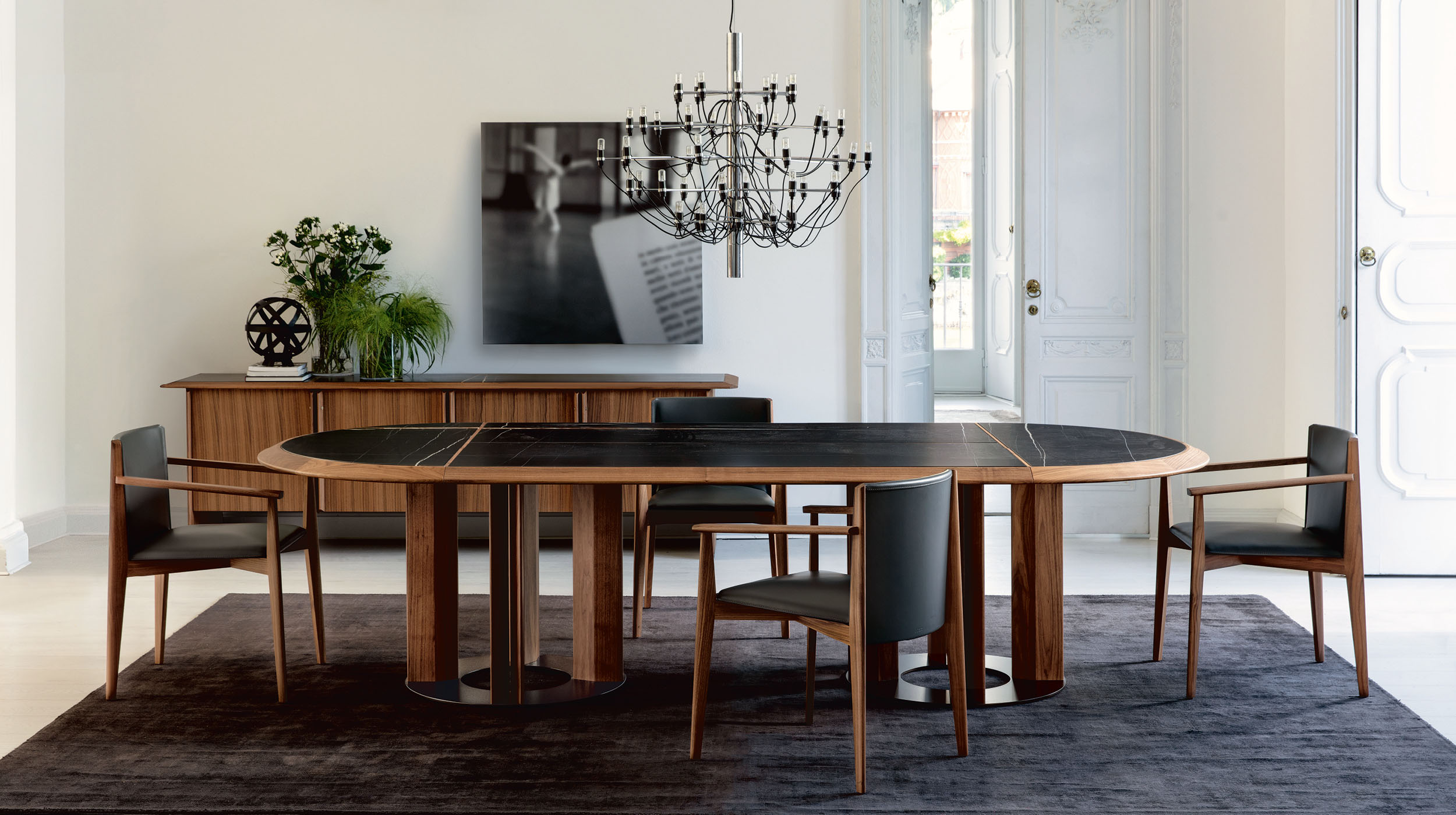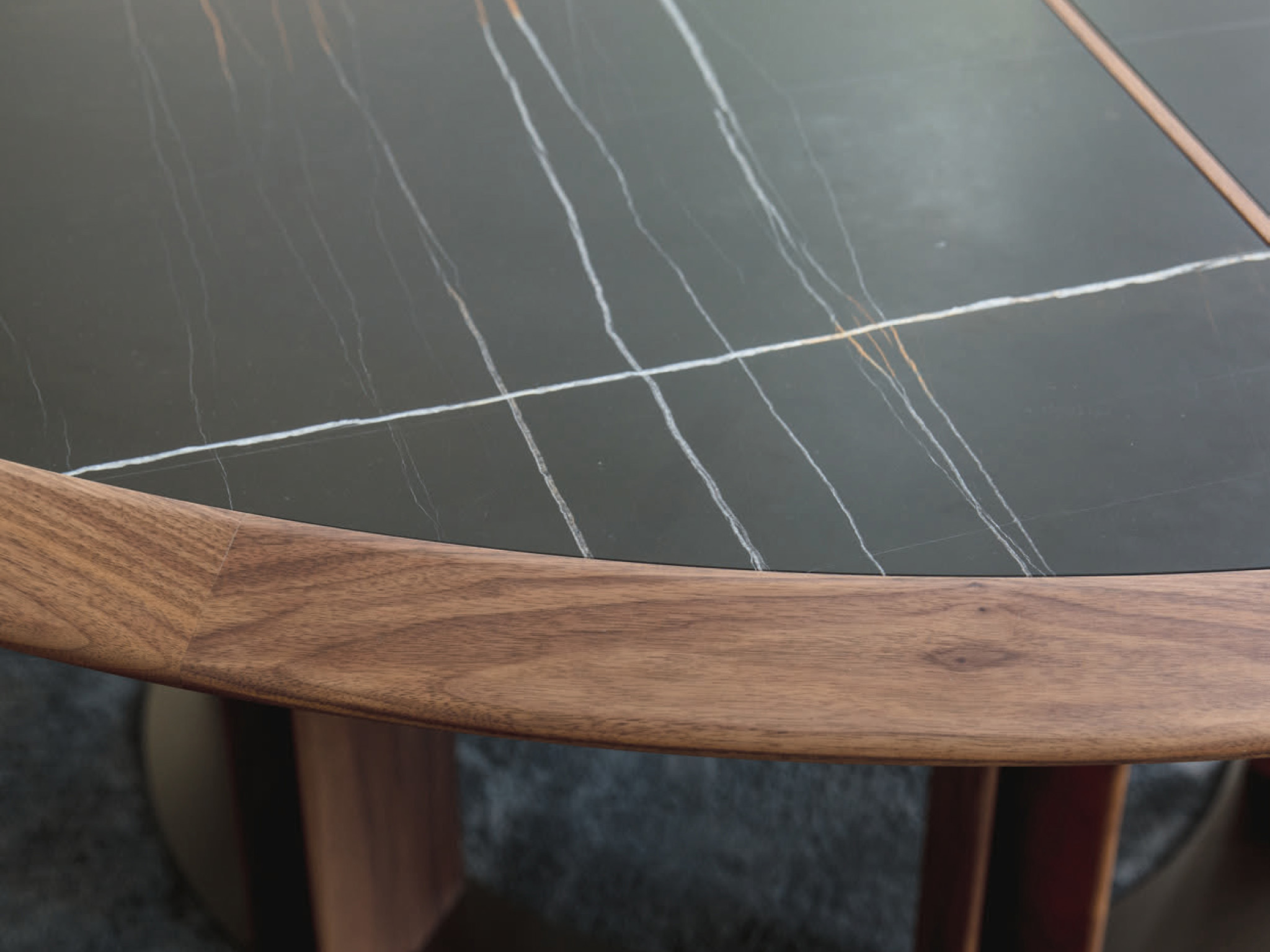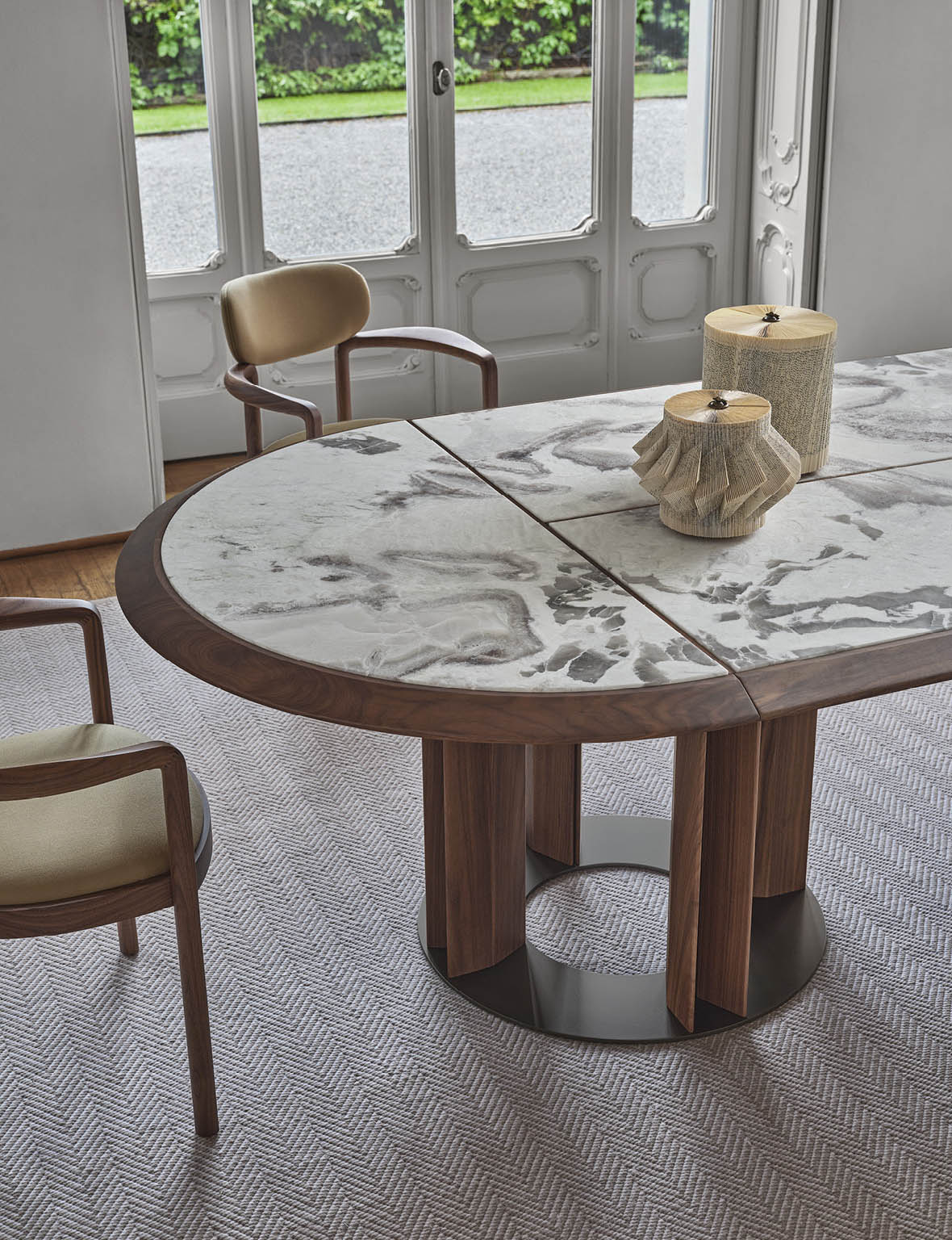 Рама стола Thayl ovale из орехового массива породы canaletta с богатой текстурой. Этот материал не просто поддерживает столешницу, но и гармонично вписывается в интерьер, добавляя ему изысканности. Столешница состоит из четырех секций, изготовленных из орехового массива. Это подчеркивает прочность и надежность всей конструкции.