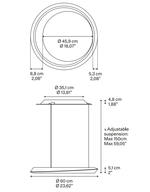 Светильник подвешивается на трех тонких тросах к круглому потолочному креплению из матового металла (белого или черного цвета). Его диаметр немного меньше кольца, что создает эффект парящего в воздухе светильника.