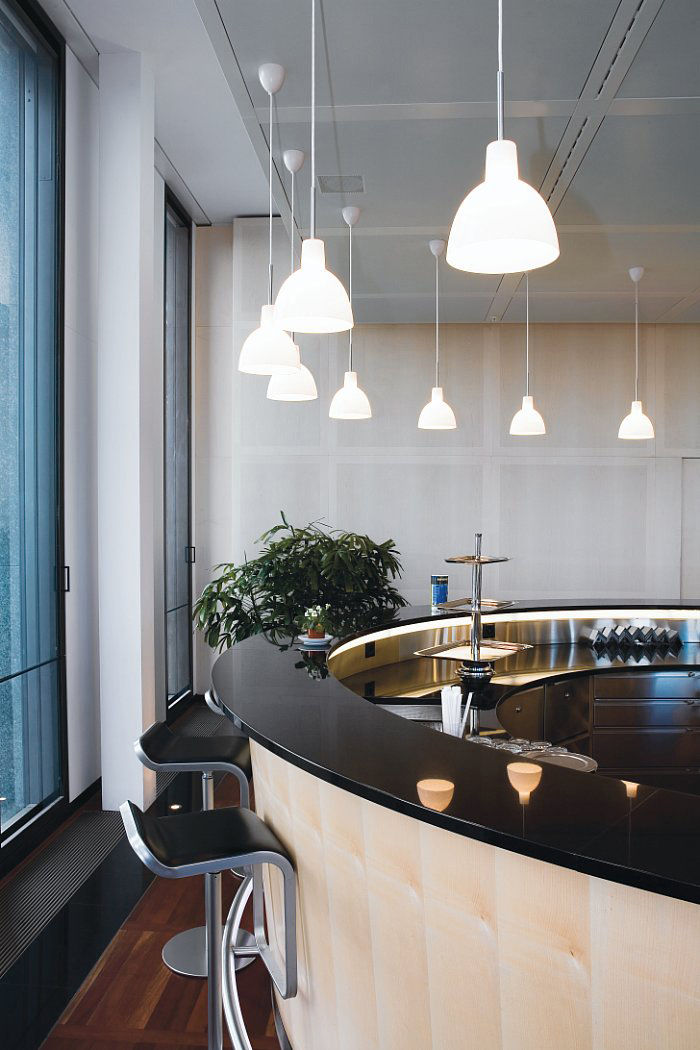 Светильник выполнен в форме эллипса с матовым белым покрытием внутренней поверхности абажура, что обеспечивает равномерное и комфортное освещение. Благодаря продуманной конструкции, основной поток света направлен вниз, в полном соответствии с принципом Poul Henningsen — создавать свет, который эффективно освещает пространство, не слепя глаза. Это делает Toldbod идеальным решением для зон, где требуется как общее, так и акцентное освещение.