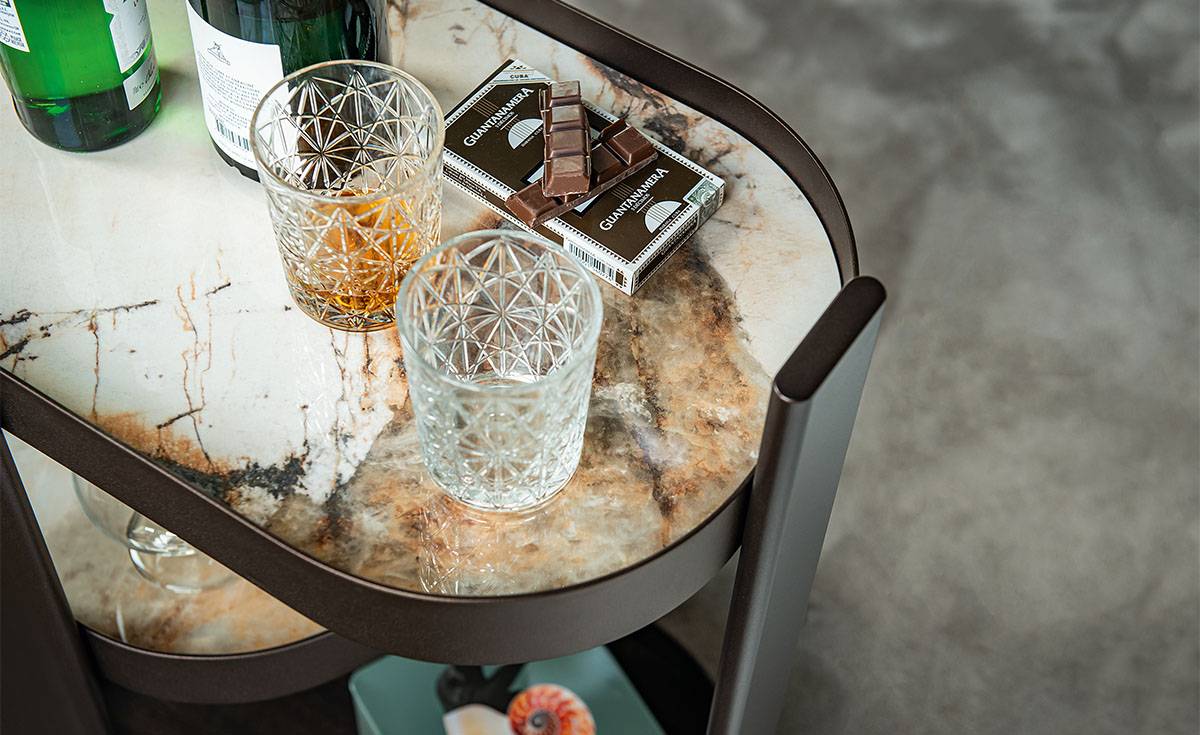 Модель отличается продуманным минимализмом: колеса скрыты за высокой металлической панелью, что создаёт иллюзию парящей мебели, а тонкая штанга для перемещения органично вписана в несущую конструкцию. Этот барный столик кажется стационарным предметом мебели, сохраняя при этом мобильность.