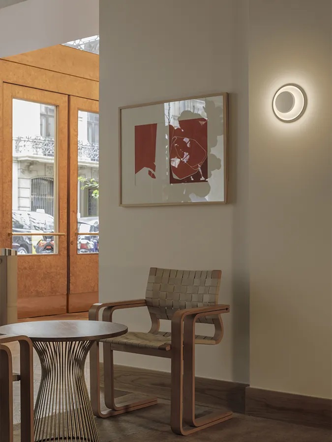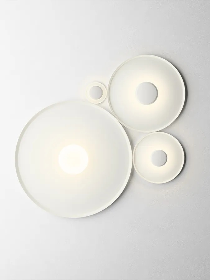 В центре каждого изделия расположен светящийся эпицентр, окруженный широким кольцом, которое словно бережно обрамляет свет в рамках чистой геометрии. Эта продуманная композиция создает визуальный эффект мягкого свечения, будто свет источает тепло из самого сердца изделия.