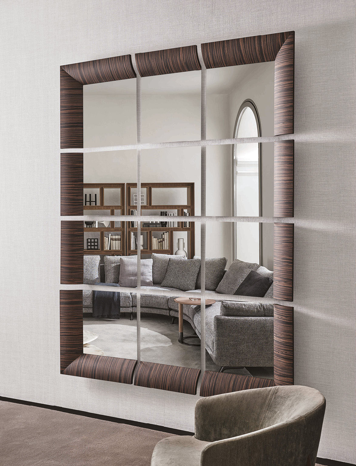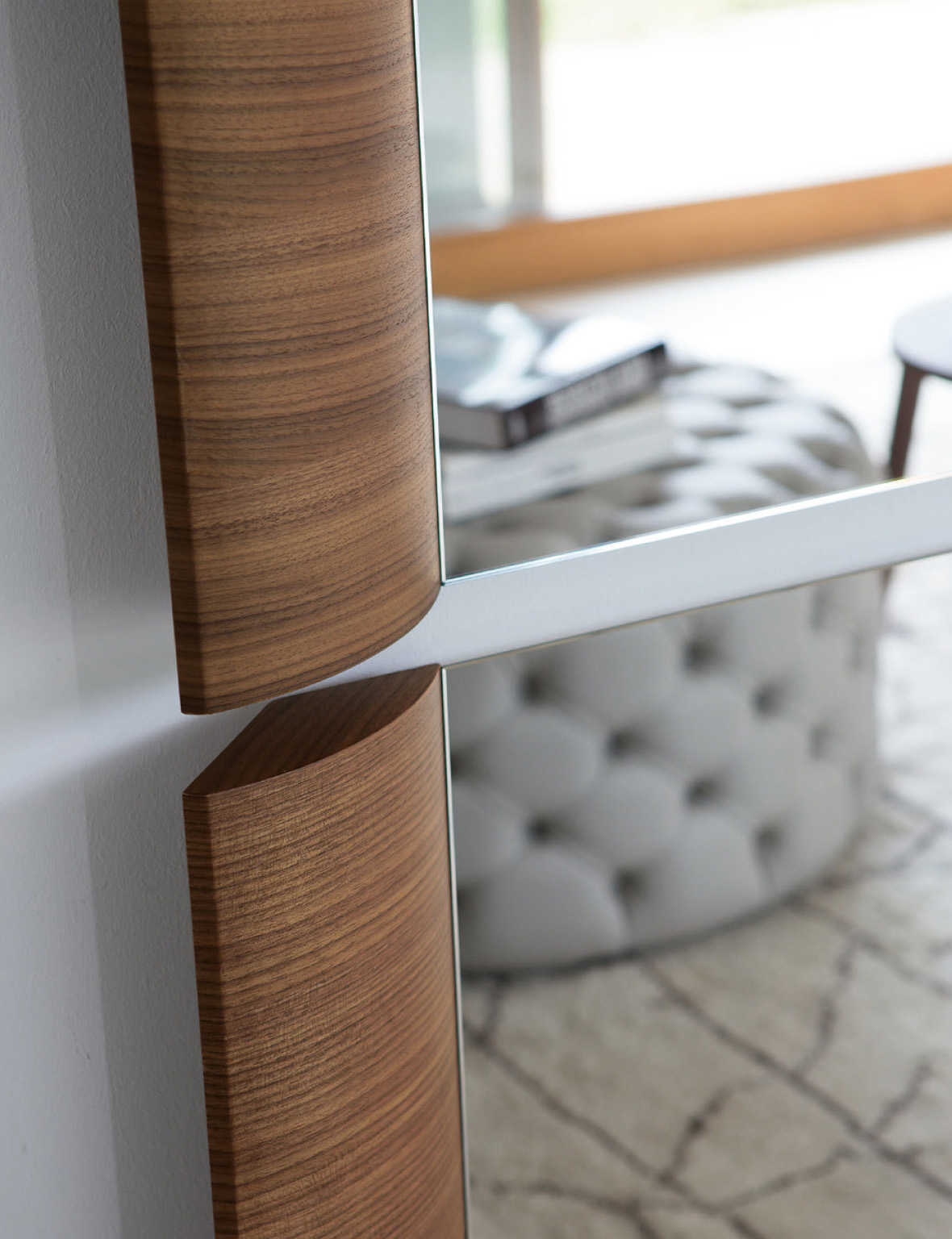 Рамка зеркала выполненная из натурального ореха Canaletta с округлым профилем, придаёт изделию мягкость и утончённость. Этот выбор материала подчёркивает природную красоту древесины, придавая зеркалу естественную элегантность. Геометрическая строгость квадратов смягчается благодаря округлым формам рамки, создавая гармоничный баланс между жёсткостью и мягкостью линий.