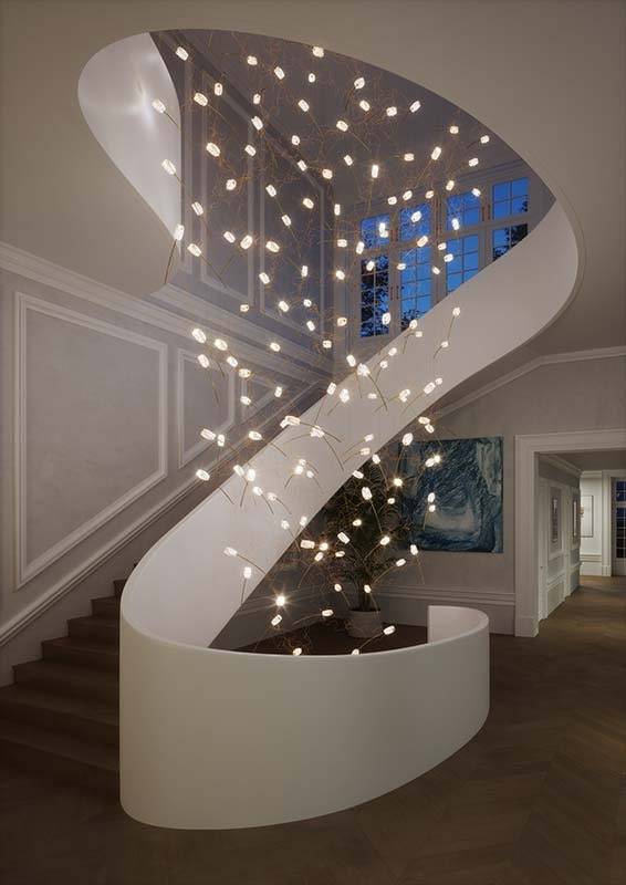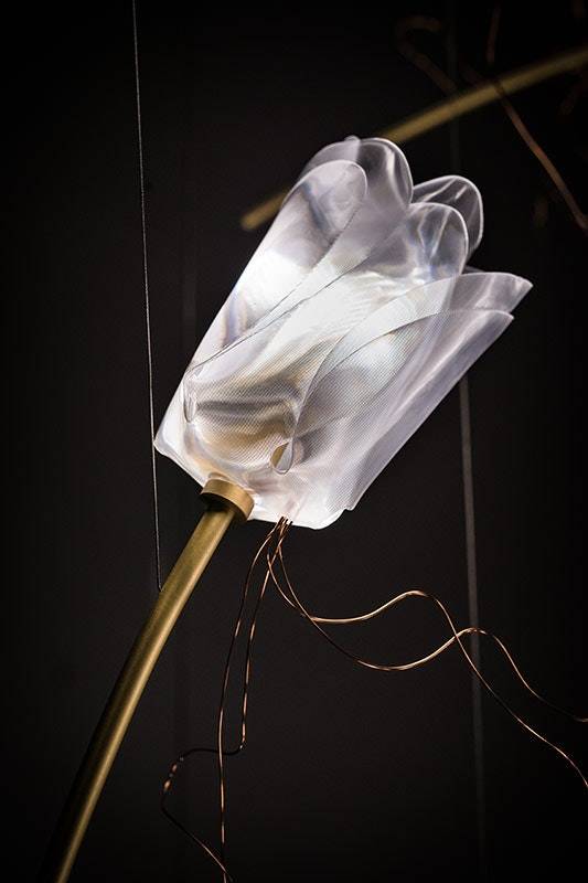 Светильник состоит из почти невидимых кабелей, которые поддерживают нежные цветы, словно парящие в воздухе. Эти цветы распускаются на матовых латунных стеблях, предварительно расположенных под тщательно выверенными углами. Такая композиция создаёт эффект естественной морфологии и гармоничного распределения света. Замысловатые медные провода не только соединяют тюльпаны между собой, но и выполняют функцию проводки, обеспечивая надёжную подачу низковольтного электричества.