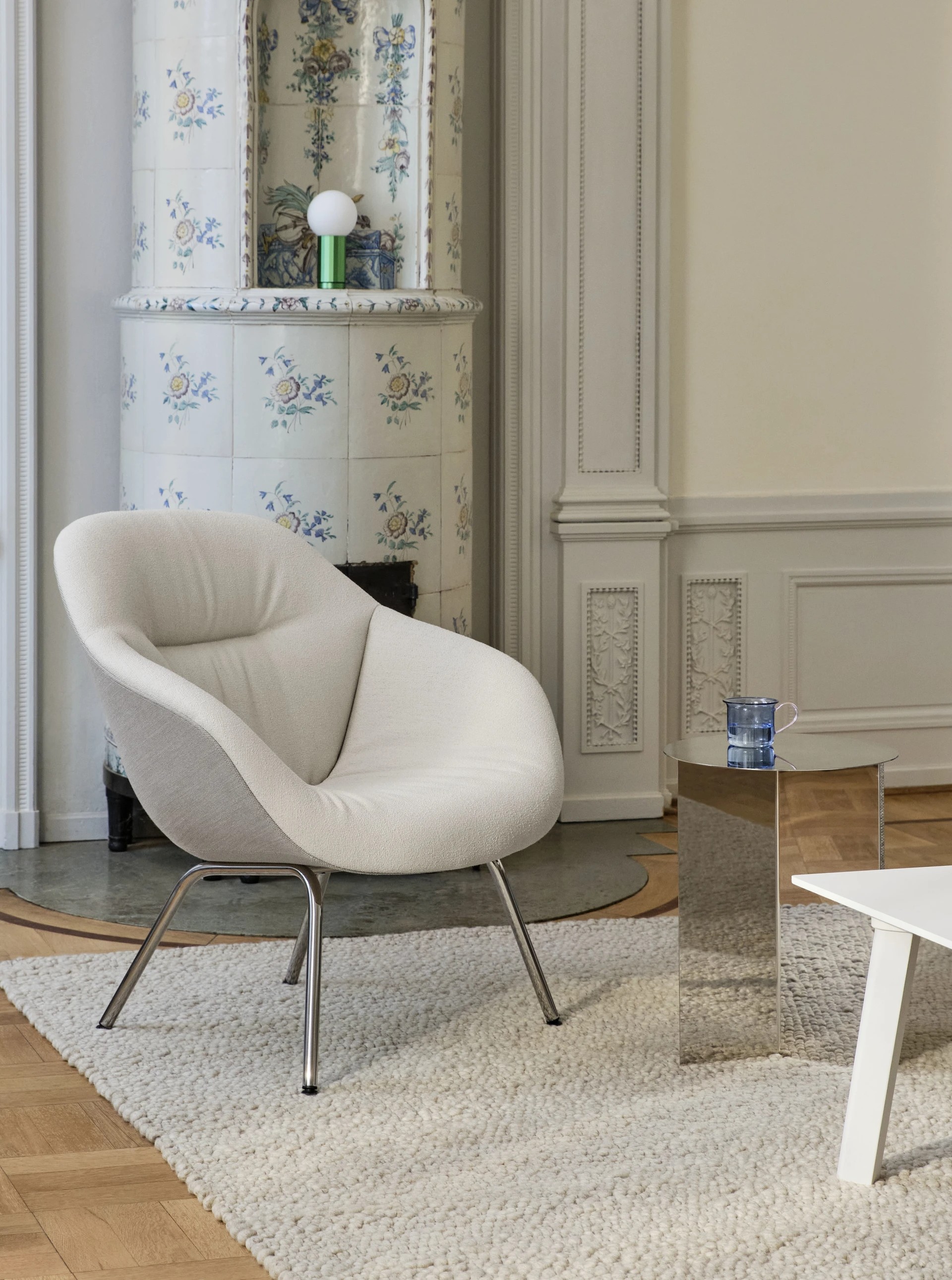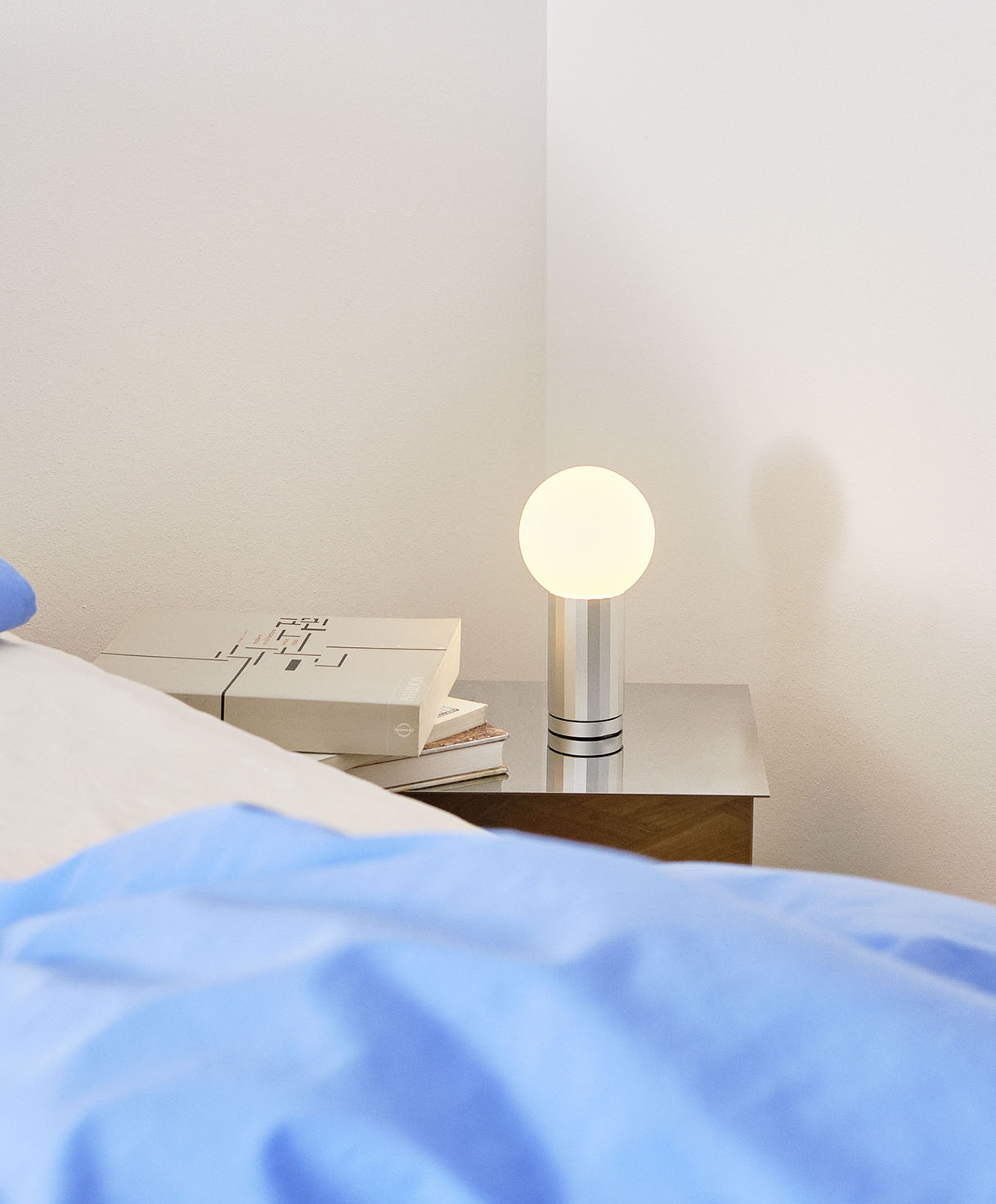 Turn On — компактная настольная лампа с современным дизайном. Её легко узнать по сочетанию сферического абажура из опалового стекла и цилиндрического основания из алюминия. Опаловое стекло мягко рассеивает свет, создавая уютную атмосферу, а строгие геометрические формы делают лампу уместной в разных интерьерах — от минимализма до скандинавского стиля.