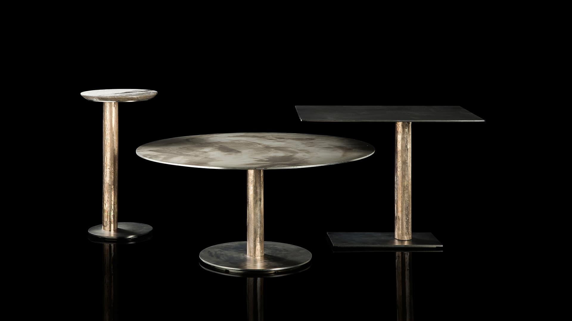Столешницы изготавливаются из металлической пластины. Это придаёт им прочность и долговечность. Они могут быть выполнены из полированной платины или титана. Также они могут иметь стандартные каменные вставки из ассортимента производителя. Формы изделий варьируются от округлых до строгих квадратных. Это позволяет подобрать подходящий вариант для любого интерьера.