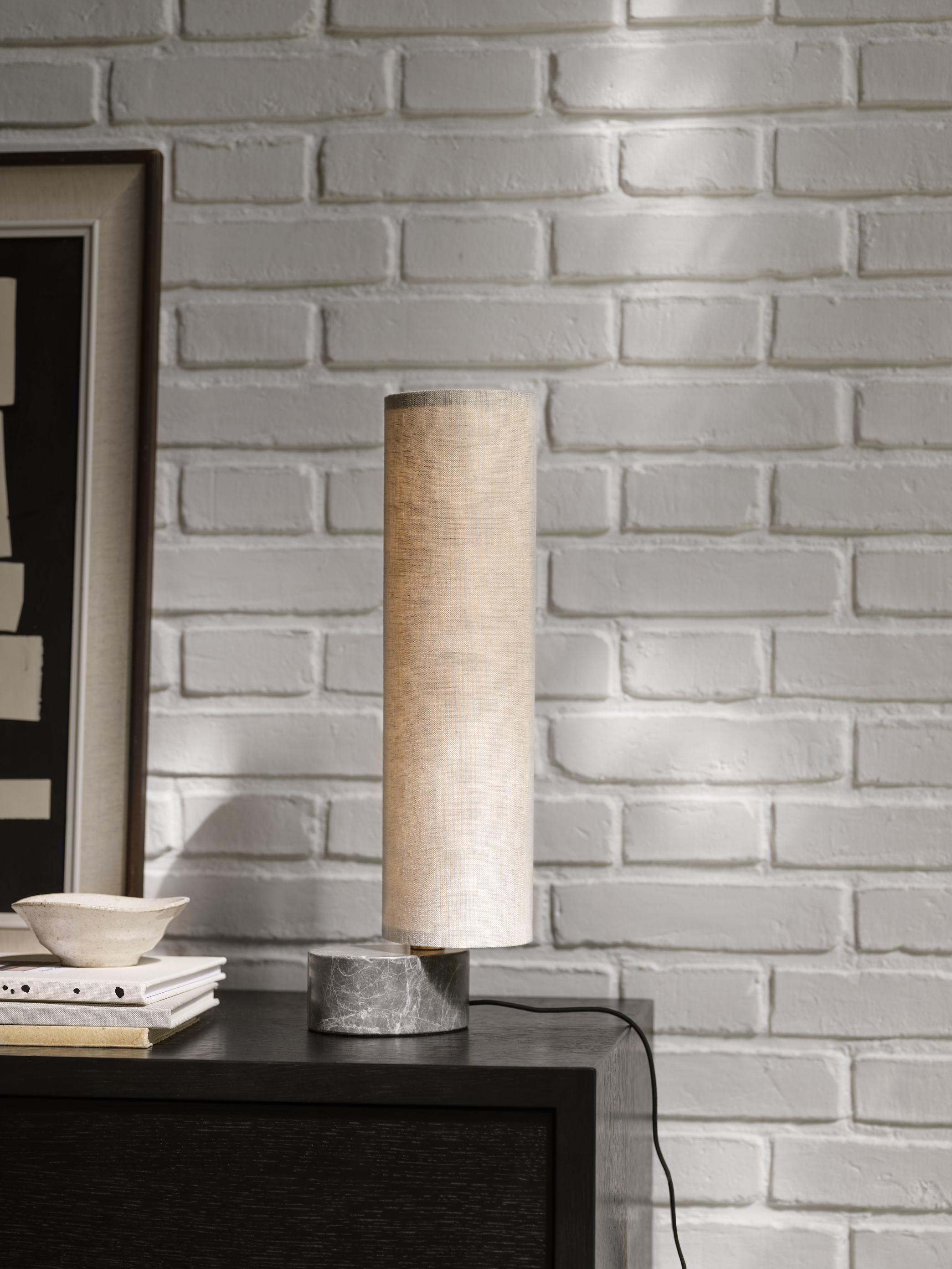 Unbound Table Lamp — это скульптурный источник мягкого атмосферного света. Доступна в двух вариантах текстиля плафона (холст или белый лён). Особенности: встроенные диммируемые светодиоды, вращающийся плафон, массивное мраморное основание. Дизайн построен на контрасте: массивное основание в форме слезы из серого мрамора символизирует устойчивость и покой, в то время как вращающийся плафон из белого льна или натурального холста той же формы кажется невесомым и динамичным. Внутри плафона, вокруг латунной мачты, расположен массив диммируемых светодиодов, создающих просторное атмосферное освещение и мягкую атмосферу.