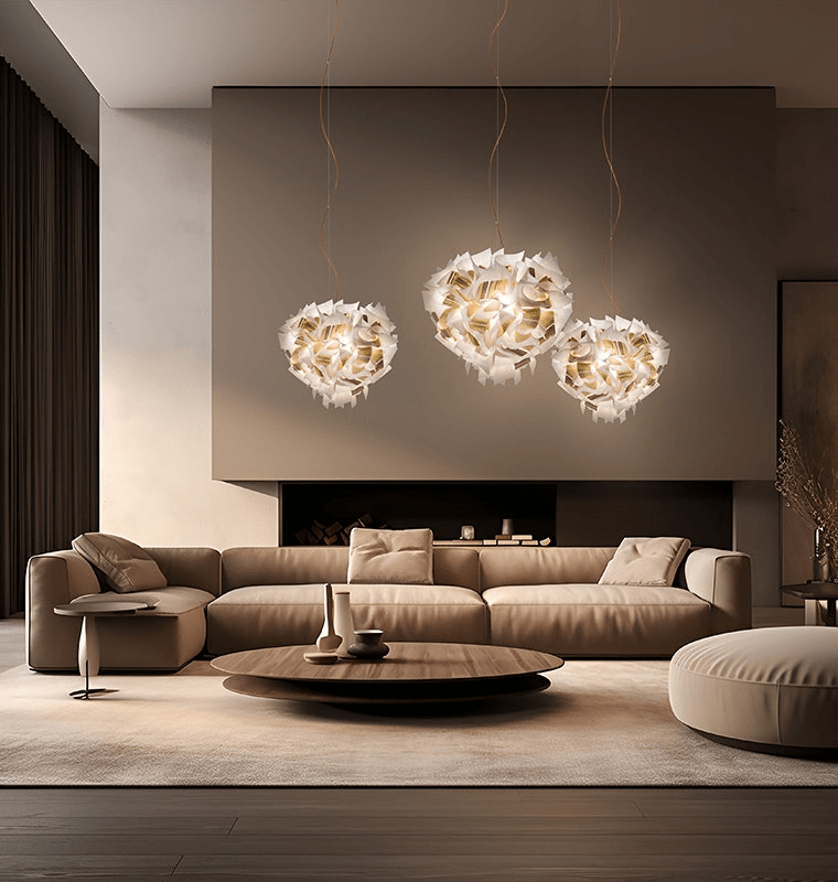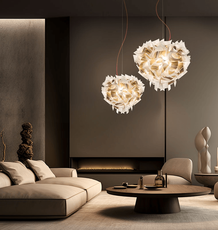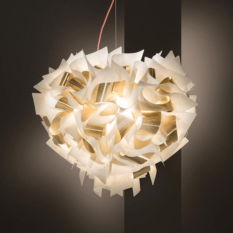 «Veli Aurea», созданный из инновационных технополимеров, обладает уникальной текстурой. Она напоминает благородные материалы, но при этом остаётся лёгкой и воздушной. Белая основа светильника дополнена изящными золотистыми акцентами. Это придаёт ему особую элегантность и утончённость. Эти детали не просто украшают светильник. Они создают эффект мягкого сияния, делая его центром притяжения в любом интерьере.