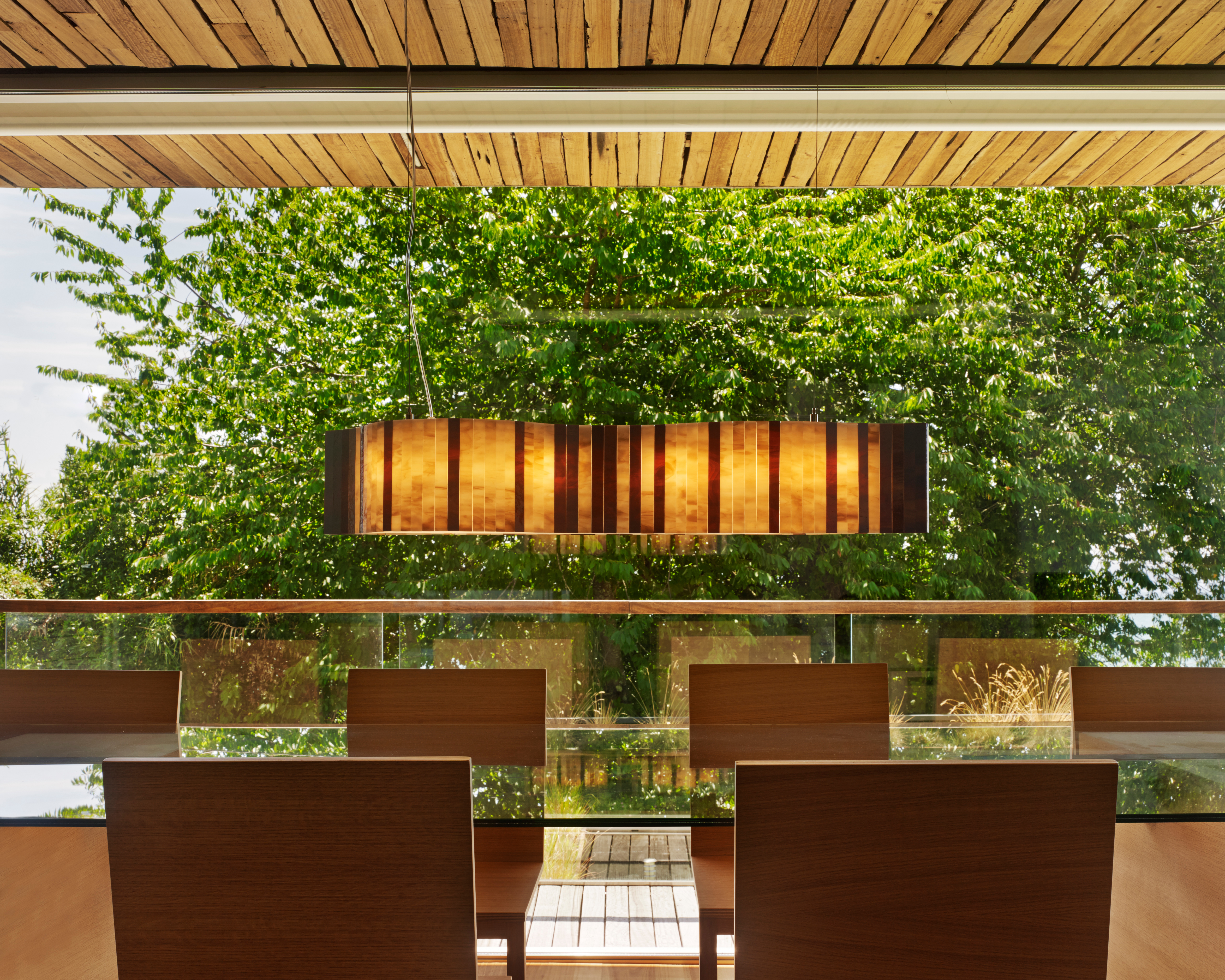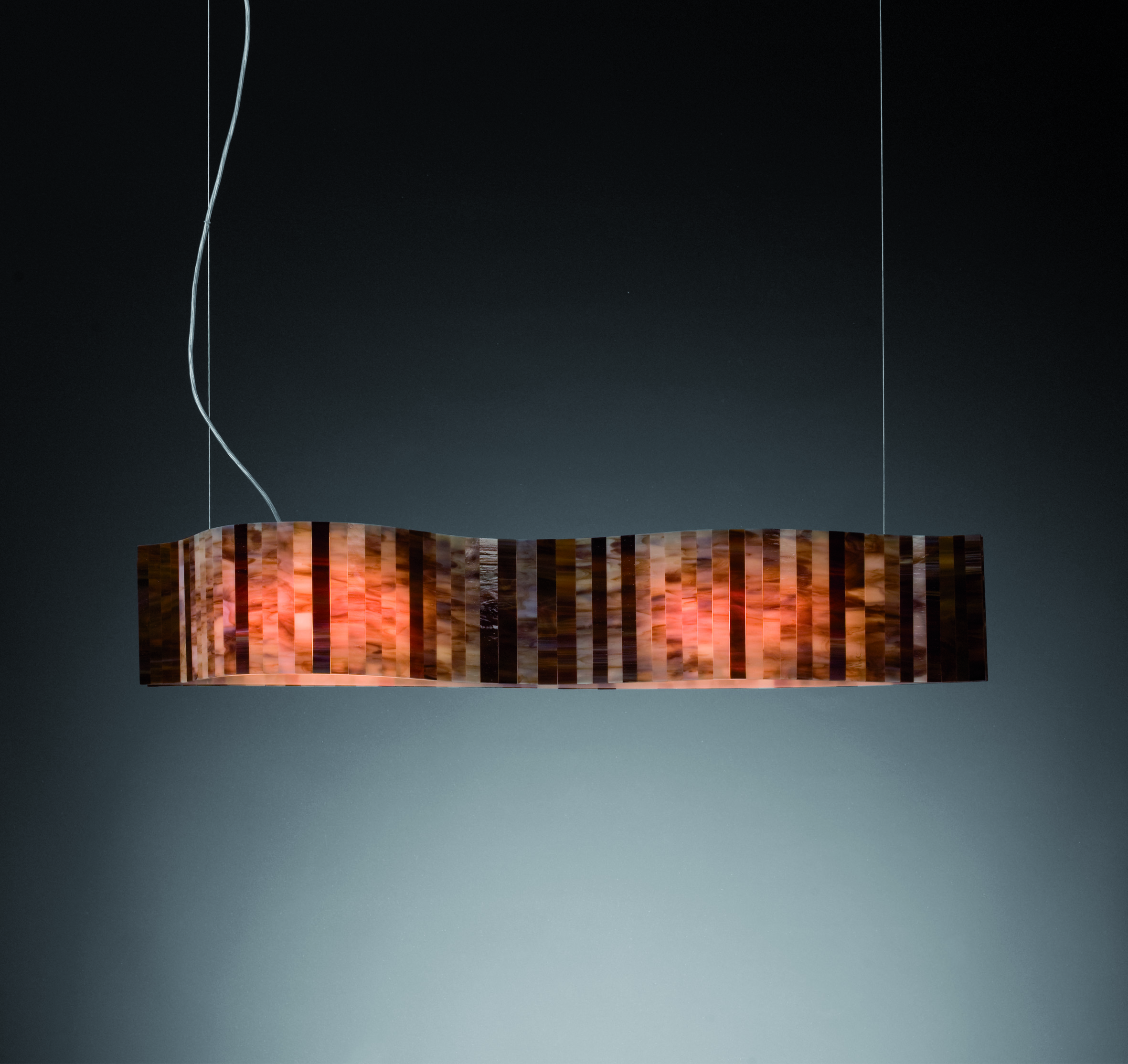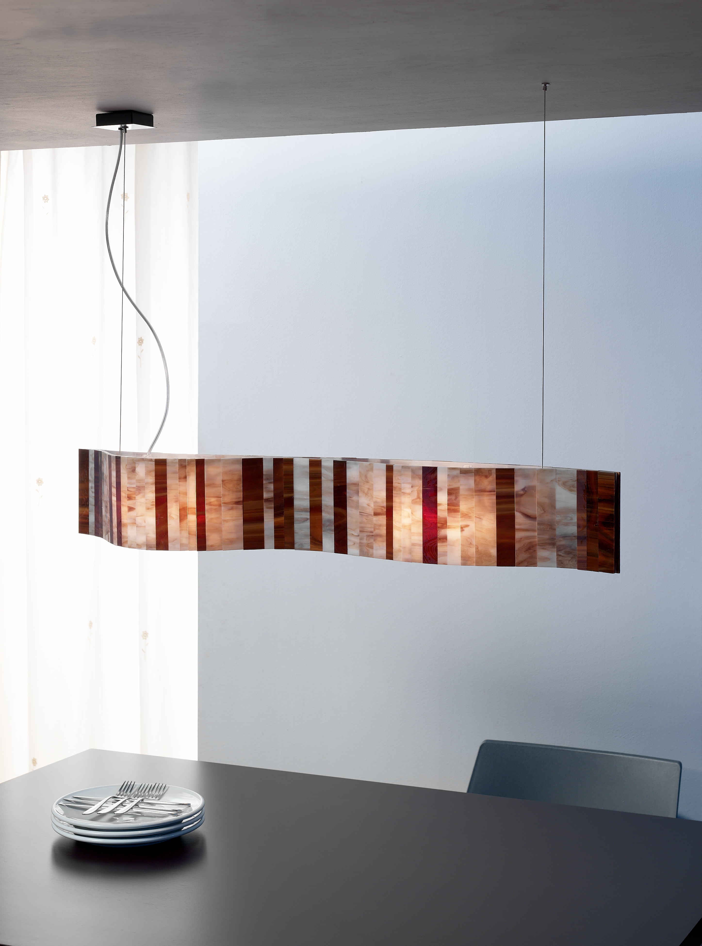 Светильник собран из небольших стеклянных пластин, которые следуют за изящной линией изгиба. Они красиво преломляют свет и привлекают взгляд чистыми, лаконичными формами. Мягкие цветовые оттенки делают светильник особенно выразительным — он не просто освещает комнату, а становится её стильным украшением.