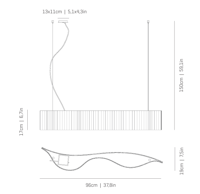 Длина подвеса — 150 см, поэтому светильник хорошо подойдёт даже для комнат с высокими потолками.