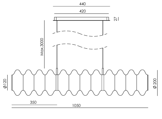 Горизонтальная геометрия и подвес на тонком тросе создают ощущение легкости и изящества, добавляя пространству динамики и движения. Контраст между блеском металла и прозрачностью стекла создает изысканный и утонченный эффект, который подчеркивает вневременную эстетику модели.