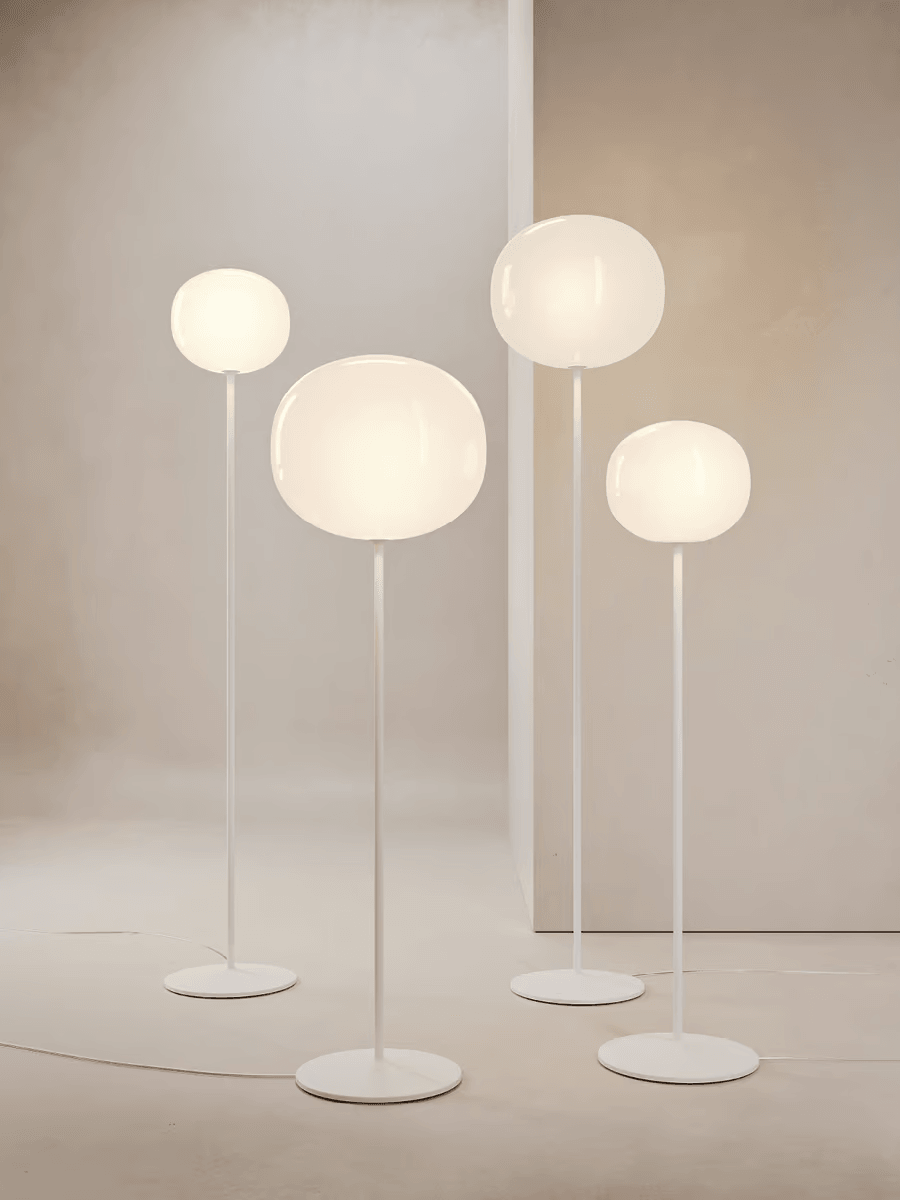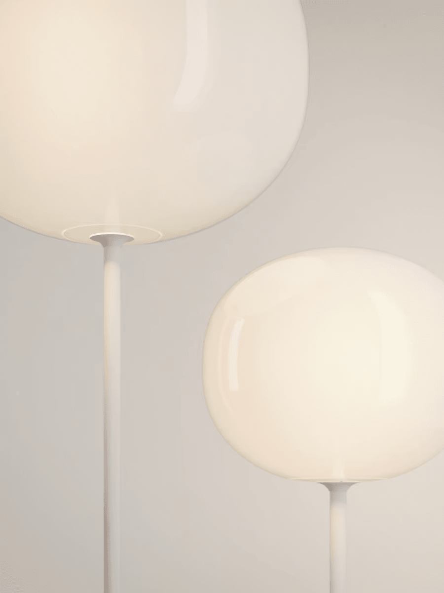 Диффузоры из дутого стекла со сферической формой имеют размеры 29 и 42 сантиметра в диаметре. Они характеризуются глянцевой белой отделкой, которая равномерно излучает свет.
