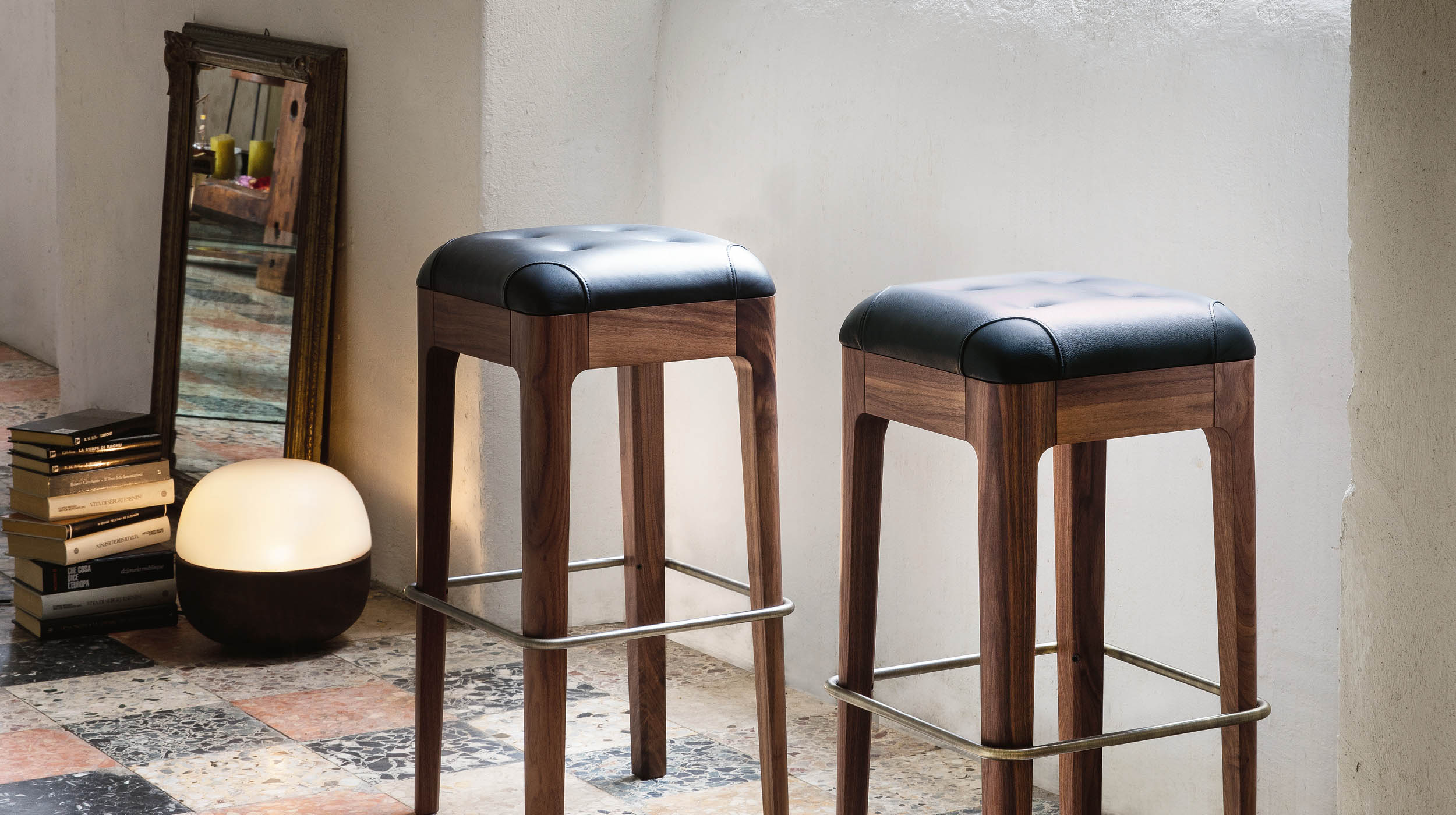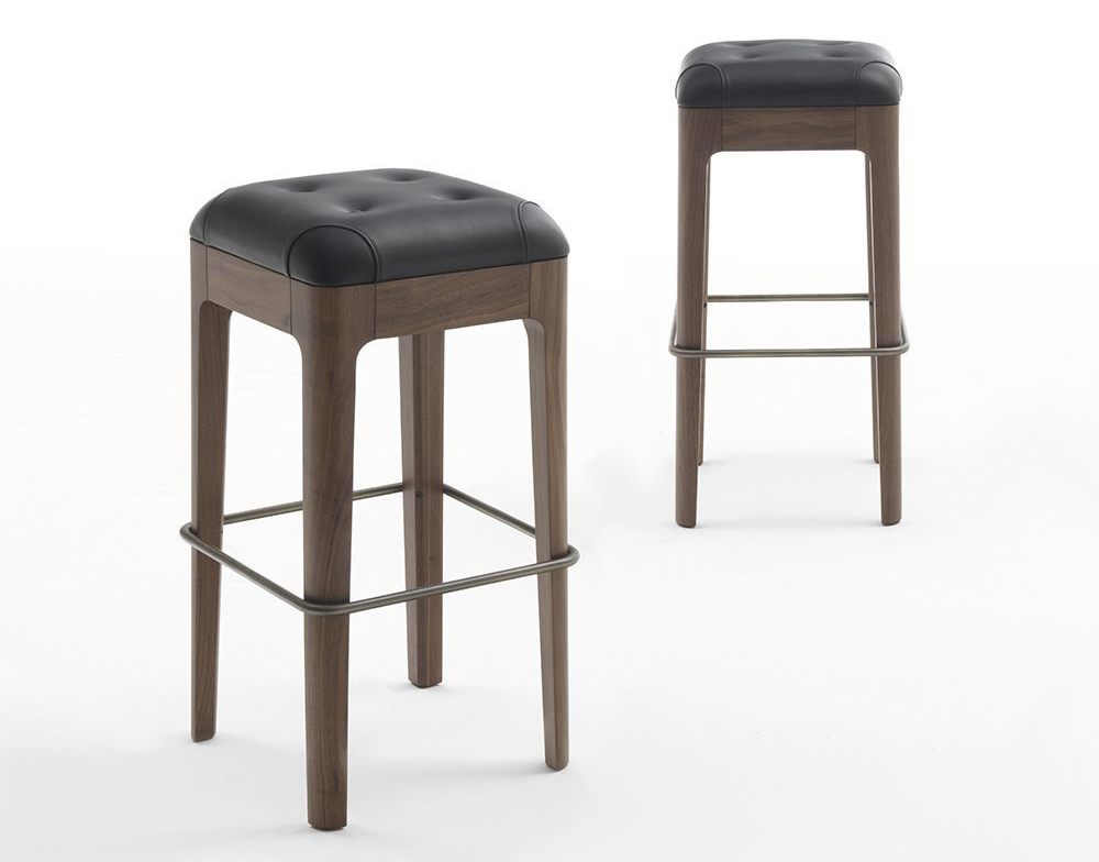 Дополнительным элементом, усиливающим эстетическое впечатление от табуретов Webby, является изящная подставка для ног, выполненная из нержавеющей стали. Эта деталь деликатно обхватывает четыре ножки табурета, изготовленные из массива дерева, придавая изделию завершенный и гармоничный вид. Подставка для ног не только функциональна, но и служит стильным акцентом, подчеркивающим премиальность всей конструкции.