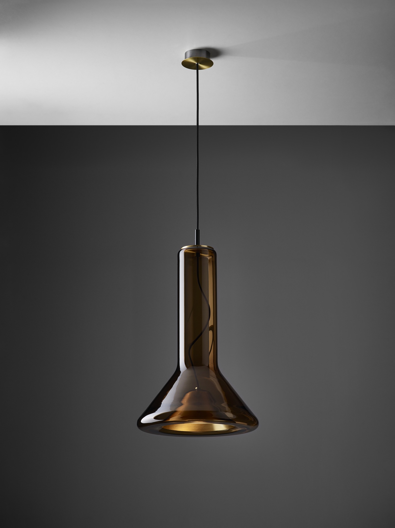 Форма корпуса светильника имитирует форму светового конуса, создавая ощущение легкости и воздушности. Прожектор с ярким лучом света и металлический экран, созданный вручную методом прессования, добавляют изделию выразительности и индивидуальности. Подвесной кабель, проходящий сквозь корпус, усиливает впечатление технического совершенства и функциональности.