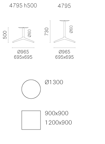 Коллекция Ypsilon включает в себя столы с круглой или квадратной столешницей различных размеров. Основание изготавливается из окрашенного, полированного или анодированного алюминия. Оно комбинируется со столешницами из стекла, пластика или стали. Детали уточняйте у менеджеров или в PDF инструкции.